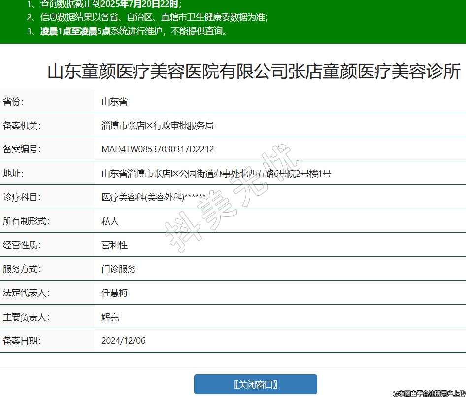 省份:山東省備案機(jī)關(guān):淄博市張店區(qū)行政審批服務(wù)局備案編號:MAD4TW08537030317D2212地址:山東省淄博市張店區(qū)公園街道辦事處北西五路6號院2號樓1號診療科目:醫(yī)療美容科(美容外科)******所有制形式:私人經(jīng)營性質(zhì):營利性服務(wù)方式:門診服務(wù)法定代表人:任慧梅主要負(fù)責(zé)人:解亮備案日期:2024/12/06 -