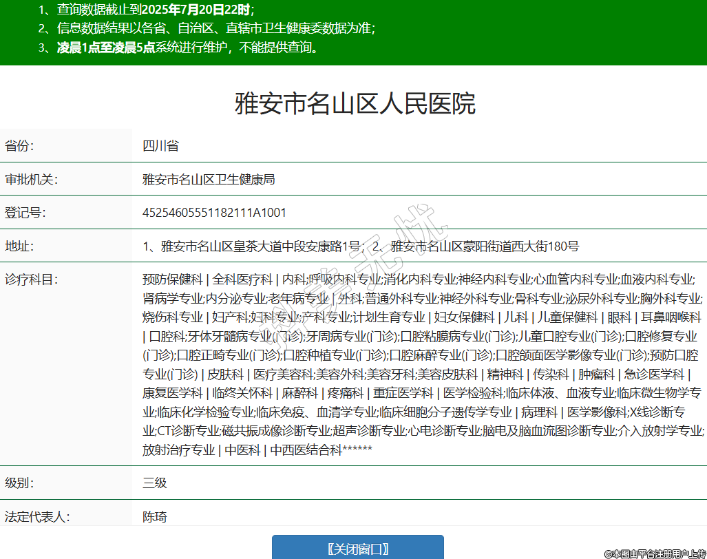 省份:四川省審批機(jī)關(guān):雅安市名山區(qū)衛(wèi)生健康局登記號:45254605551182111A1001地址:1、雅安市名山區(qū)皇茶大道中段安康路1號;2、雅安市名山區(qū)蒙陽街道西大街180號診療科目:預(yù)防保健科 | 全科醫(yī)療科 | 內(nèi)科;呼吸內(nèi)科專業(yè);消化內(nèi)科專業(yè);神經(jīng)內(nèi)科專業(yè);心血管內(nèi)科專業(yè);血液內(nèi)科專業(yè);腎病學(xué)專業(yè);內(nèi)分泌專業(yè);老年病專業(yè) | 外科;普通外科專業(yè);神經(jīng)外科專業(yè);骨科專業(yè);泌尿外科專業(yè);胸外科專業(yè);燒傷科專業(yè) | 婦產(chǎn)科;婦科專業(yè);產(chǎn)科專業(yè);計(jì)劃生育專業(yè) | 婦女保健科 | 兒科 | 兒童保健科 | 眼科 | 耳鼻咽喉科 | 口腔科;牙體牙髓病專業(yè)(門診);牙周病專業(yè)(門診);口腔粘膜病專業(yè)(門診);兒童口腔專業(yè)(門診);口腔修復(fù)專業(yè)(門診);口腔正畸專業(yè)(門診);口腔種植專業(yè)(門診);口腔麻醉專業(yè)(門診);口腔頜面醫(yī)學(xué)影像專業(yè)(門診);預(yù)防口腔專業(yè)(門診) | 皮膚科 | 醫(yī)療美容科;美容外科;美容牙科;美容皮膚科 | 精神科 | 傳染科 | 腫瘤科 | 急診醫(yī)學(xué)科 | 康復(fù)醫(yī)學(xué)科 | 臨終關(guān)懷科 | 麻醉科 | 疼痛科 | 重癥醫(yī)學(xué)科 | 醫(yī)學(xué)檢驗(yàn)科;臨床體液、血液專業(yè);臨床微生物學(xué)專業(yè);臨床化學(xué)檢驗(yàn)專業(yè);臨床免疫、血清學(xué)專業(yè);臨床細(xì)胞分子遺傳學(xué)專業(yè) | 病理科 | 醫(yī)學(xué)影像科;X線診斷專業(yè);CT診斷專業(yè);磁共振成像診斷專業(yè);超聲診斷專業(yè);心電診斷專業(yè);腦電及腦血流圖診斷專業(yè);介入放射學(xué)專業(yè);放射治療專業(yè) | 中醫(yī)科 | 中西醫(yī)結(jié)合科******級別:三級法定代表人:陳琦主要負(fù)責(zé)人:陳琦執(zhí)業(yè)許可證有效期:2020/08/07 -至- 2035/08/06 -