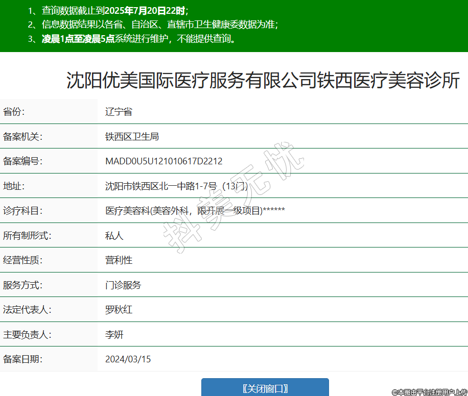 沈陽(yáng)優(yōu)美國(guó)際醫(yī)療服務(wù)有限公司鐵西醫(yī)療美容診所,診療科目:醫(yī)療美容科(美容外科,限開(kāi)展一級(jí)項(xiàng)目)******