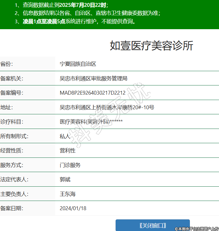 省份:寧夏回族自治區(qū)備案機(jī)關(guān):吳忠市利通區(qū)審批服務(wù)管理局備案編號(hào):MAD8P2E9264030217D2212地址:吳忠市利通區(qū)上橋街道水岸康橋20#-10號(hào)診療科目:醫(yī)療美容科(美容外科)******所有制形式:私人經(jīng)營(yíng)性質(zhì):營(yíng)利性服務(wù)方式:門診服務(wù)法定代表人:郭斌主要負(fù)責(zé)人:王東海備案日期:2024/01/18 -
