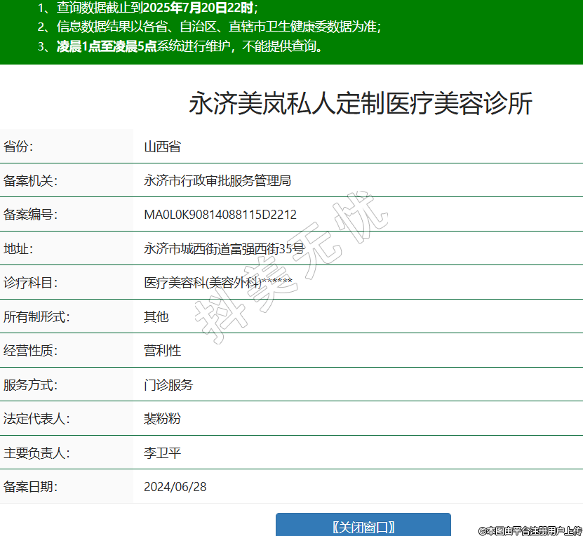 省份:山西省備案機關:永濟市行政審批服務管理局備案編號:MA0L0K90814088115D2212地址:永濟市城西街道富強西街35號診療科目:醫(yī)療美容科(美容外科)******所有制形式:其他經(jīng)營性質(zhì):營利性服務方式:門診服務法定代表人:裴粉粉主要負責人:李衛(wèi)平備案日期:2024/06/28 -