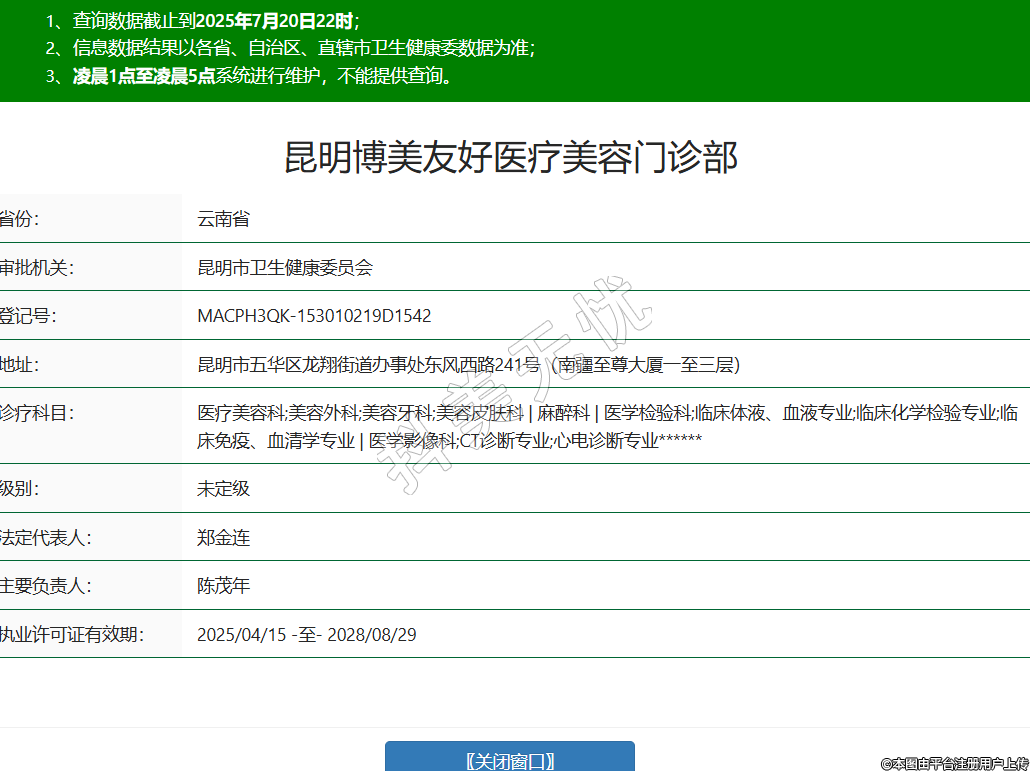 省份:云南省審批機(jī)關(guān):昆明市衛(wèi)生健康委員會(huì)登記號(hào):MACPH3QK-153010219D1542地址:昆明市五華區(qū)龍翔街道辦事處東風(fēng)西路241號(hào)(南疆至尊大廈一至三層)診療科目:醫(yī)療美容科;美容外科;美容牙科;美容皮膚科 | 麻醉科 | 醫(yī)學(xué)檢驗(yàn)科;臨床體液、血液專業(yè);臨床化學(xué)檢驗(yàn)專業(yè);臨床免疫、血清學(xué)專業(yè) | 醫(yī)學(xué)影像科;CT診斷專業(yè);心電診斷專業(yè)******級(jí)別:未定級(jí)法定代表人:鄭金連主要負(fù)責(zé)人:陳茂年執(zhí)業(yè)許可證有效期:2025/04/15 -至- 2028/08/29 -