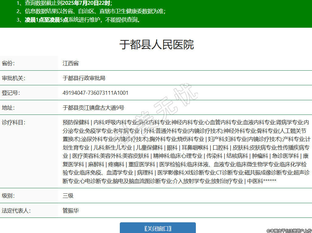 省份:江西省審批機關(guān):于都縣行政審批局登記號:49194047-736073111A1001地址:于都縣貢江鎮(zhèn)盤古大道9號診療科目:預(yù)防保健科 | 內(nèi)科;呼吸內(nèi)科專業(yè);消化內(nèi)科專業(yè);神經(jīng)內(nèi)科專業(yè);心血管內(nèi)科專業(yè);血液內(nèi)科專業(yè);腎病學(xué)專業(yè);內(nèi)分泌專業(yè);免疫學(xué)專業(yè);老年病專業(yè) | 外科;普通外科專業(yè)(內(nèi)鏡診療技術(shù));神經(jīng)外科專業(yè);骨科專業(yè)(人工髖關(guān)節(jié)置換術(shù));泌尿外科專業(yè)(內(nèi)鏡診療技術(shù));胸外科專業(yè);燒傷科專業(yè) | 婦產(chǎn)科;婦科專業(yè)(內(nèi)鏡診療技術(shù));產(chǎn)科專業(yè);計劃生育專業(yè) | 兒科;新生兒專業(yè) | 兒童保健科 | 眼科 | 耳鼻咽喉科 | 口腔科 | 皮膚科;皮膚病專業(yè);性傳播疾病專業(yè) | 醫(yī)療美容科;美容外科;美容皮膚科 | 精神科;臨床心理專業(yè) | 傳染科 | 結(jié)核病科 | 腫瘤科 | 急診醫(yī)學(xué)科 | 康復(fù)醫(yī)學(xué)科 | 麻醉科 | 疼痛科 | 重癥醫(yī)學(xué)科 | 醫(yī)學(xué)檢驗科;臨床體液、血液專業(yè);臨床微生物學(xué)專業(yè);臨床化學(xué)檢驗專業(yè);臨床免疫、血清學(xué)專業(yè) | 病理科 | 醫(yī)學(xué)影像科;X線診斷專業(yè);CT診斷專業(yè);磁共振成像診斷專業(yè);超聲診斷專業(yè);心電診斷專業(yè);腦電及腦血流圖診斷專業(yè);介入放射學(xué)專業(yè);放射治療專業(yè) | 中醫(yī)科******級別:三級法定代表人:管振華主要負(fù)責(zé)人:管振華執(zhí)業(yè)許可證有效期:2024/10/21 -至- 2037/05/13 -