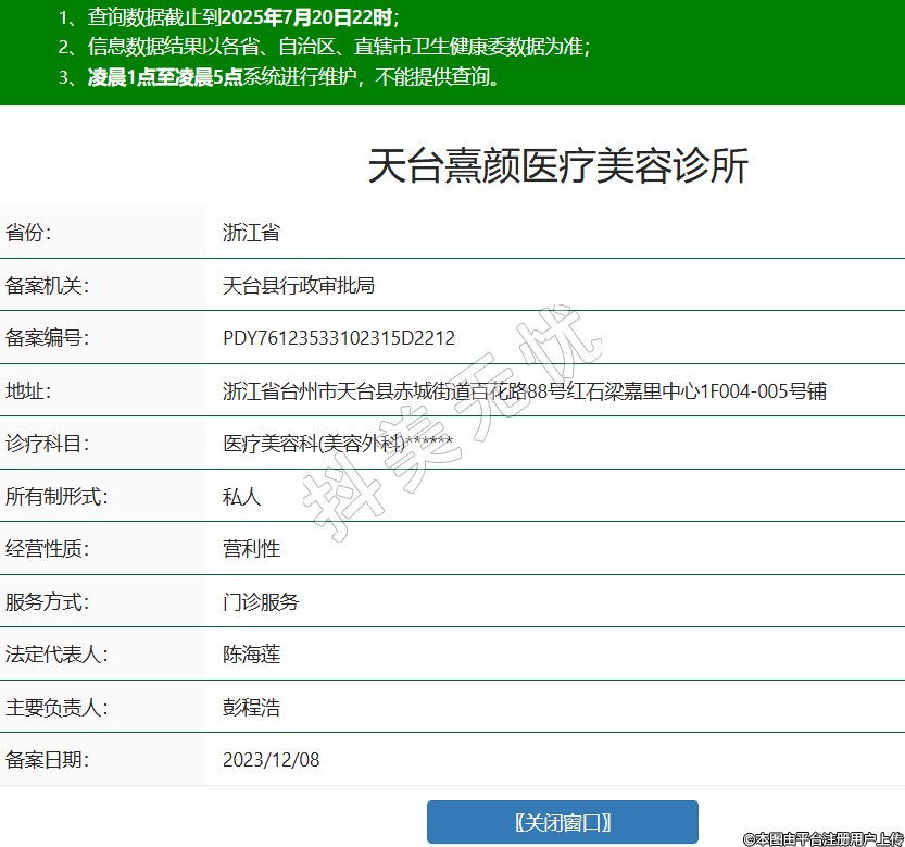 省份:浙江省備案機(jī)關(guān):天臺(tái)縣行政審批局備案編號(hào):PDY76123533102315D2212地址:浙江省臺(tái)州市天臺(tái)縣赤城街道百花路88號(hào)紅石梁嘉里中心1F004-005號(hào)鋪診療科目:醫(yī)療美容科(美容外科)******所有制形式:私人經(jīng)營性質(zhì):營利性服務(wù)方式:門診服務(wù)法定代表人:陳海蓮主要負(fù)責(zé)人:彭程浩備案日期:2023/12/08 -