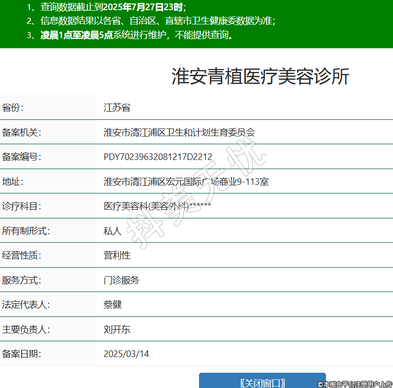 省份:江蘇省備案機(jī)關(guān):淮安市清江浦區(qū)衛(wèi)生和計(jì)劃生育委員會(huì)備案編號(hào):PDY70239632081217D2212地址:淮安市清江浦區(qū)宏元國(guó)際廣場(chǎng)商業(yè)9-113室診療科目:醫(yī)療美容科(美容外科)******所有制形式:私人經(jīng)營(yíng)性質(zhì):營(yíng)利性服務(wù)方式:門診服務(wù)法定代表人:蔡健主要負(fù)責(zé)人:劉開東備案日期:2025/03/14 -