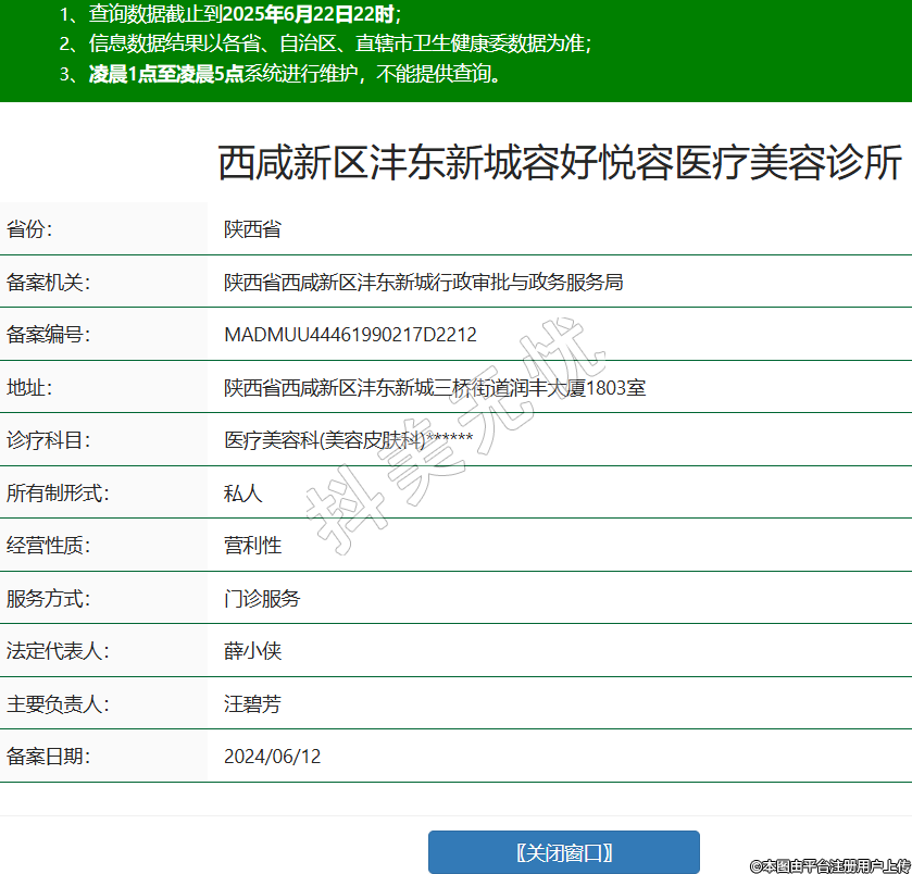省份:陜西省備案機(jī)關(guān):陜西省西咸新區(qū)灃東新城行政審批與政務(wù)服務(wù)局備案編號:MADMUU44461990217D2212地址:陜西省西咸新區(qū)灃東新城三橋街道潤豐大廈1803室診療科目:醫(yī)療美容科(美容皮膚科)******所有制形式:私人經(jīng)營性質(zhì):營利性服務(wù)方式:門診服務(wù)法定代表人:薛小俠主要負(fù)責(zé)人:汪碧芳備案日期:2024/06/12 -