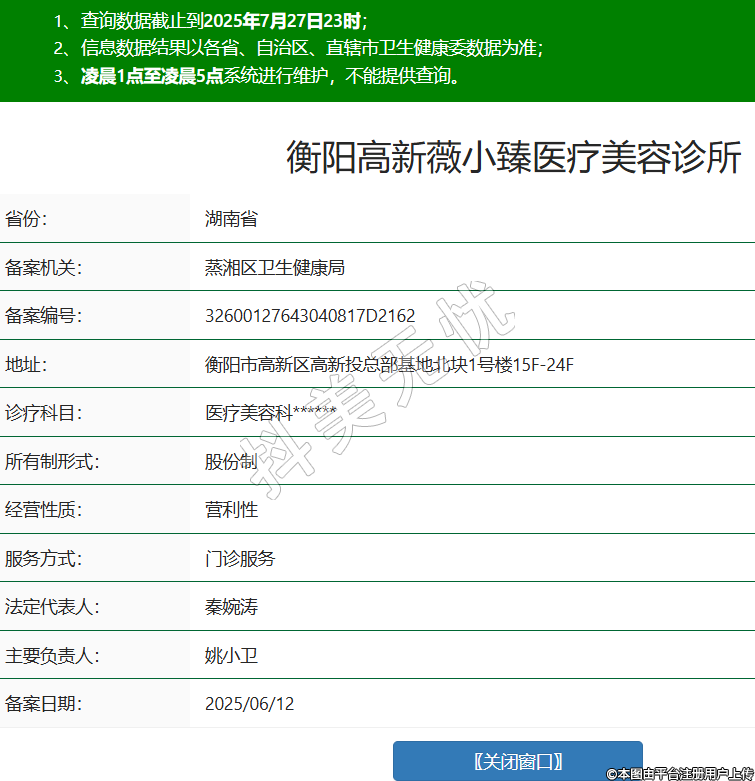 省份:湖南省備案機關(guān):蒸湘區(qū)衛(wèi)生健康局備案編號:32600127643040817D2162地址:衡陽市高新區(qū)高新投總部基地北塊1號樓15F-24F診療科目:醫(yī)療美容科******所有制形式:股份制經(jīng)營性質(zhì):營利性服務(wù)方式:門診服務(wù)法定代表人:秦婉濤主要負責(zé)人:姚小衛(wèi)備案日期:2025/06/12 -