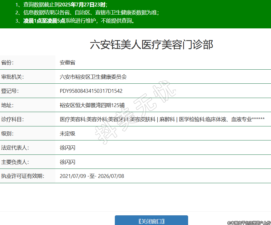 省份:安徽省審批機(jī)關(guān):六安市裕安區(qū)衛(wèi)生健康委員會登記號:PDY95808434150317D1542地址:裕安區(qū)恒大御景灣四期125鋪診療科目:醫(yī)療美容科;美容外科;美容牙科;美容皮膚科 | 麻醉科 | 醫(yī)學(xué)檢驗科;臨床體液、血液專業(yè)******級別:未定級法定代表人:徐閃閃主要負(fù)責(zé)人:徐閃閃執(zhí)業(yè)許可證有效期:2021/07/09 -至- 2026/07/08 -