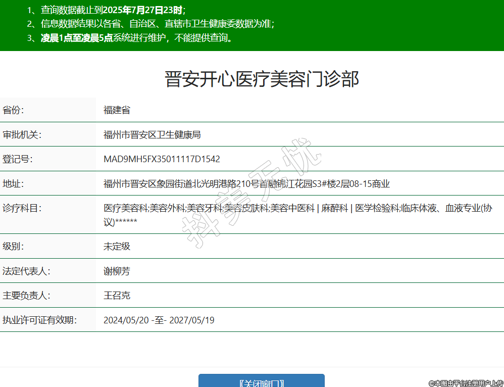 省份:福建省審批機(jī)關(guān):福州市晉安區(qū)衛(wèi)生健康局登記號:MAD9MH5FX35011117D1542地址:福州市晉安區(qū)象園街道北光明港路210號首融錦江花園S3#樓2層08-15商業(yè)診療科目:醫(yī)療美容科;美容外科;美容牙科;美容皮膚科;美容中醫(yī)科 | 麻醉科 | 醫(yī)學(xué)檢驗(yàn)科;臨床體液、血液專業(yè)(協(xié)議)******級別:未定級法定代表人:謝柳芳主要負(fù)責(zé)人:王召克執(zhí)業(yè)許可證有效期:2024/05/20 -至- 2027/05/19 -