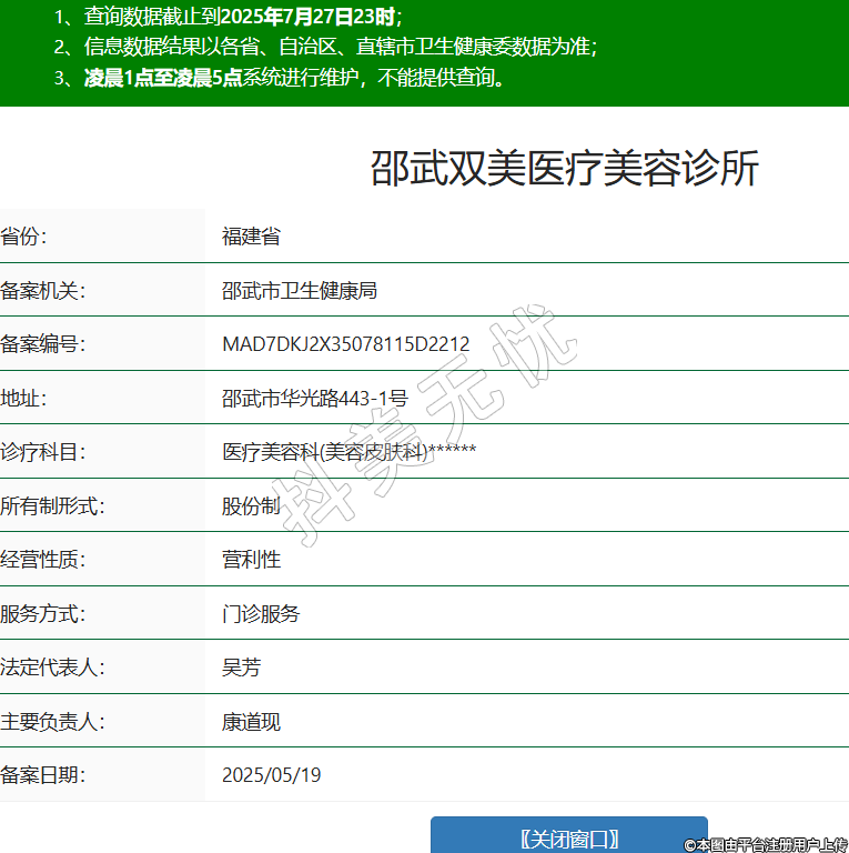 省份:福建省備案機(jī)關(guān):邵武市衛(wèi)生健康局備案編號(hào):MAD7DKJ2X35078115D2212地址:邵武市華光路443-1號(hào)診療科目:醫(yī)療美容科(美容皮膚科)******所有制形式:股份制經(jīng)營(yíng)性質(zhì):營(yíng)利性服務(wù)方式:門(mén)診服務(wù)法定代表人:吳芳主要負(fù)責(zé)人:康道現(xiàn)備案日期:2025/05/19 -