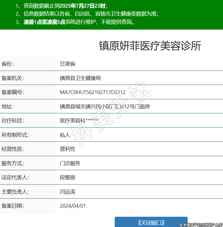 省份:甘肅省備案機關(guān):鎮(zhèn)原縣衛(wèi)生健康局備案編號:MA7C0HUT562102717D2212地址:鎮(zhèn)原縣城關(guān)鎮(zhèn)興民小區(qū)門口412號門面房診療科目:醫(yī)療美容科******所有制形式:私人經(jīng)營性質(zhì):營利性服務(wù)方式:門診服務(wù)法定代表人:段雅麗主要負責(zé)人:閆運濤備案日期:2024/04/01 -