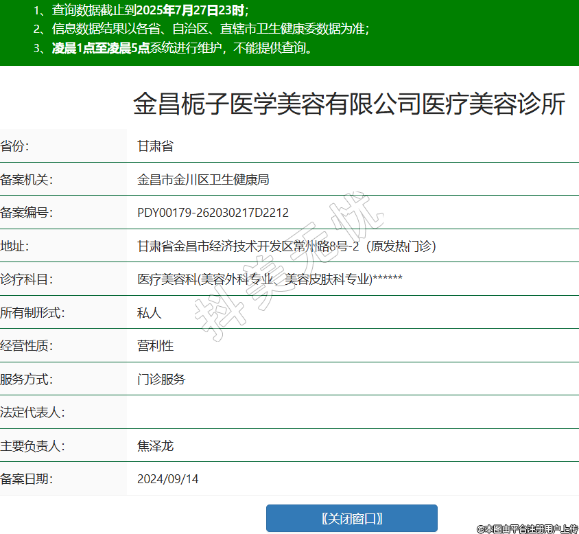 省份:甘肅省備案機關:金昌市金川區(qū)衛(wèi)生健康局備案編號:PDY00179-262030217D2212地址:甘肅省金昌市經(jīng)濟技術開發(fā)區(qū)常州路8號-2(原發(fā)熱門診)診療科目:醫(yī)療美容科(美容外科專業(yè)、美容皮膚科專業(yè))******所有制形式:私人經(jīng)營性質:營利性服務方式:門診服務法定代表人:主要負責人:焦?jié)升?/div>備案日期:2024/09/14