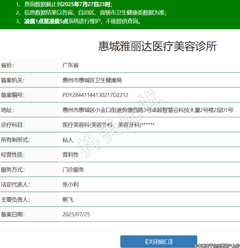 省份:廣東省備案機(jī)關(guān):惠州市惠城區(qū)衛(wèi)生健康局備案編號(hào):PDY28441144130217D2212地址:惠州市惠城區(qū)小金口街道黃塘西路3號(hào)卓超智慧谷科技大廈2號(hào)樓2層01號(hào)診療科目:醫(yī)療美容科(美容外科、美容牙科)******所有制形式:私人經(jīng)營(yíng)性質(zhì):營(yíng)利性服務(wù)方式:門診服務(wù)法定代表人:張小利主要負(fù)責(zé)人:熊飛備案日期:2025/07/25 -