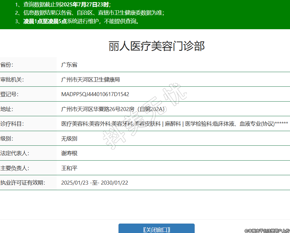 省份:廣東省審批機關(guān):廣州市天河區(qū)衛(wèi)生健康局登記號:MADPP5QJ444010617D1542地址:廣州市天河區(qū)華夏路26號202房(自編202A)診療科目:醫(yī)療美容科;美容外科;美容牙科;美容皮膚科 | 麻醉科 | 醫(yī)學(xué)檢驗科;臨床體液、血液專業(yè)(協(xié)議)******級別:無級別法定代表人:謝壽根主要負(fù)責(zé)人:王和平執(zhí)業(yè)許可證有效期:2025/01/23 -至- 2030/01/22 -