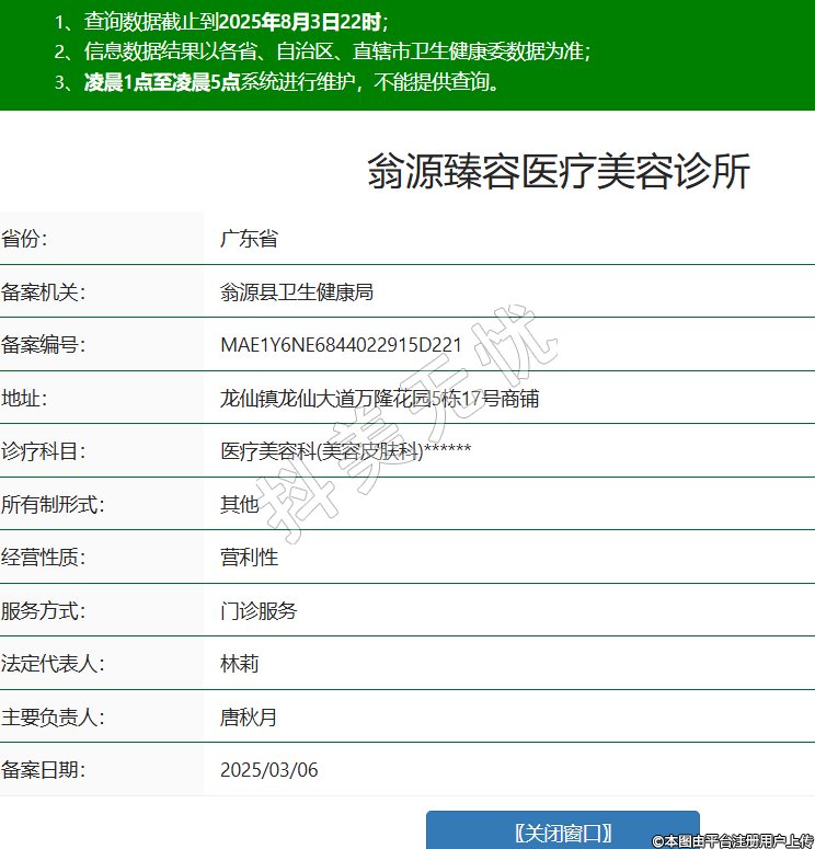 省份:廣東省備案機關:翁源縣衛(wèi)生健康局備案編號:MAE1Y6NE6844022915D221地址:龍仙鎮(zhèn)龍仙大道萬隆花園5棟17號商鋪診療科目:醫(yī)療美容科(美容皮膚科)******所有制形式:其他經(jīng)營性質:營利性服務方式:門診服務法定代表人:林莉主要負責人:唐秋月備案日期:2025/03/06 -