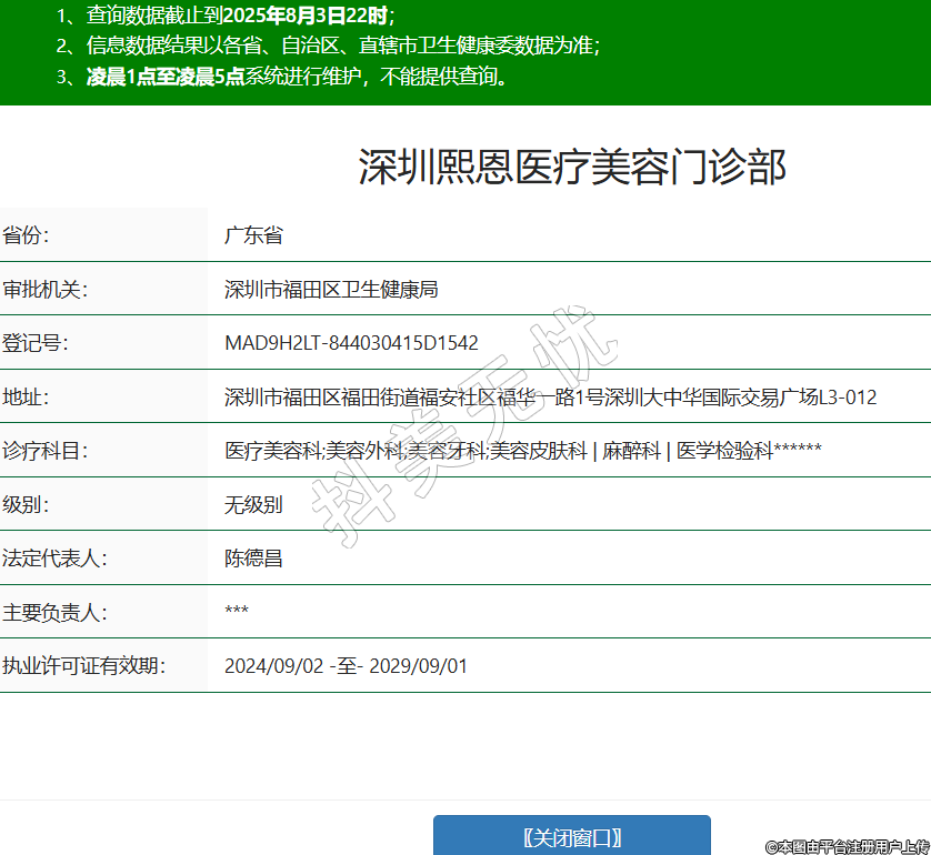 省份:廣東省審批機(jī)關(guān):深圳市福田區(qū)衛(wèi)生健康局登記號(hào):MAD9H2LT-844030415D1542地址:深圳市福田區(qū)福田街道福安社區(qū)福華一路1號(hào)深圳大中華國(guó)際交易廣場(chǎng)L3-012診療科目:醫(yī)療美容科;美容外科;美容牙科;美容皮膚科 | 麻醉科 | 醫(yī)學(xué)檢驗(yàn)科******級(jí)別:無級(jí)別法定代表人:陳德昌主要負(fù)責(zé)人:***執(zhí)業(yè)許可證有效期:2024/09/02 -至- 2029/09/01 -