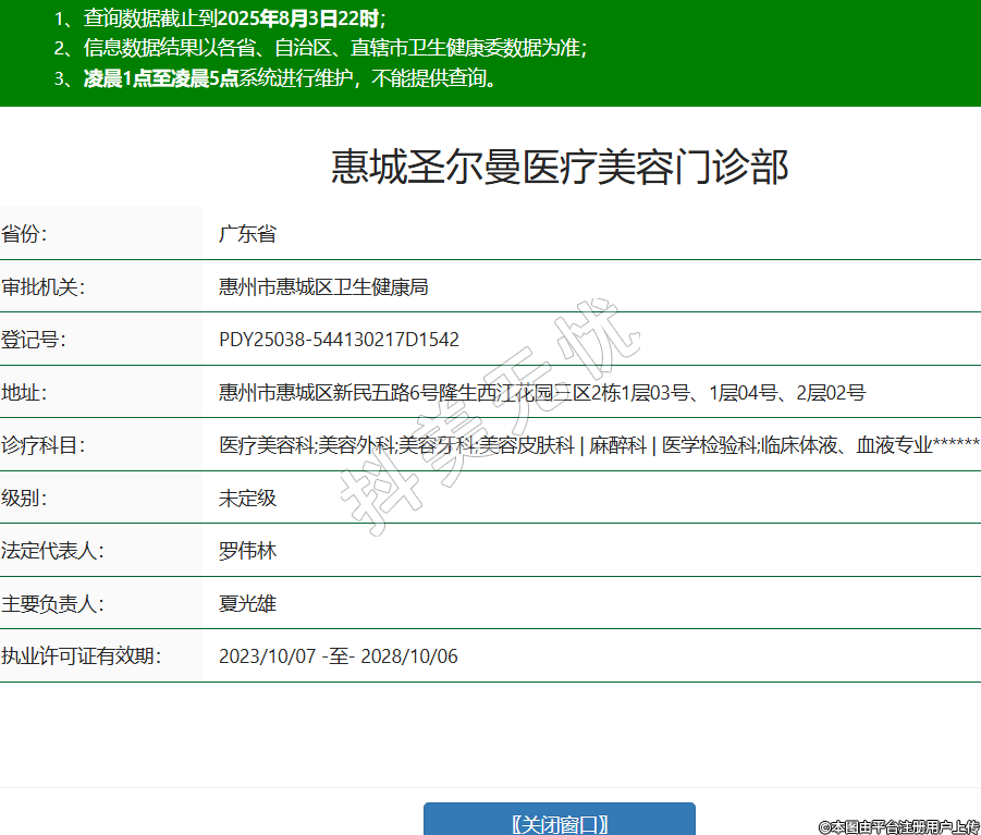 省份:廣東省審批機(jī)關(guān):惠州市惠城區(qū)衛(wèi)生健康局登記號(hào):PDY25038-544130217D1542地址:惠州市惠城區(qū)新民五路6號(hào)隆生西江花園三區(qū)2棟1層03號(hào)、1層04號(hào)、2層02號(hào)診療科目:醫(yī)療美容科;美容外科;美容牙科;美容皮膚科 | 麻醉科 | 醫(yī)學(xué)檢驗(yàn)科;臨床體液、血液專業(yè)******級(jí)別:未定級(jí)法定代表人:羅偉林主要負(fù)責(zé)人:夏光雄執(zhí)業(yè)許可證有效期:2023/10/07 -至- 2028/10/06 -