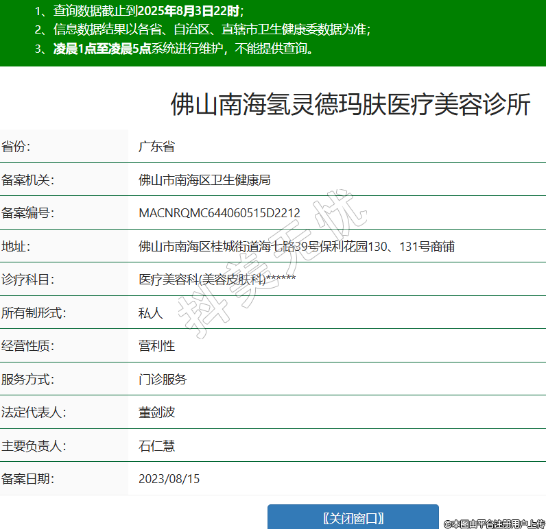 省份:廣東省備案機(jī)關(guān):佛山市南海區(qū)衛(wèi)生健康局備案編號(hào):MACNRQMC644060515D2212地址:佛山市南海區(qū)桂城街道海七路39號(hào)保利花園130、131號(hào)商鋪診療科目:醫(yī)療美容科(美容皮膚科)******所有制形式:私人經(jīng)營(yíng)性質(zhì):營(yíng)利性服務(wù)方式:門診服務(wù)法定代表人:董劍波主要負(fù)責(zé)人:石仁慧備案日期:2023/08/15 -