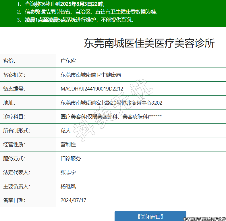 省份:廣東省備案機(jī)關(guān):東莞市南城街道衛(wèi)生健康局備案編號:MACDHYJJ244190019D2212地址:東莞市南城街道宏北路20號恒兆商務(wù)中心3202診療科目:醫(yī)療美容科(僅限美容外科,美容皮膚科)******所有制形式:私人經(jīng)營性質(zhì):營利性服務(wù)方式:門診服務(wù)法定代表人:張志寧主要負(fù)責(zé)人:楊繼風(fēng)備案日期:2024/07/17 -