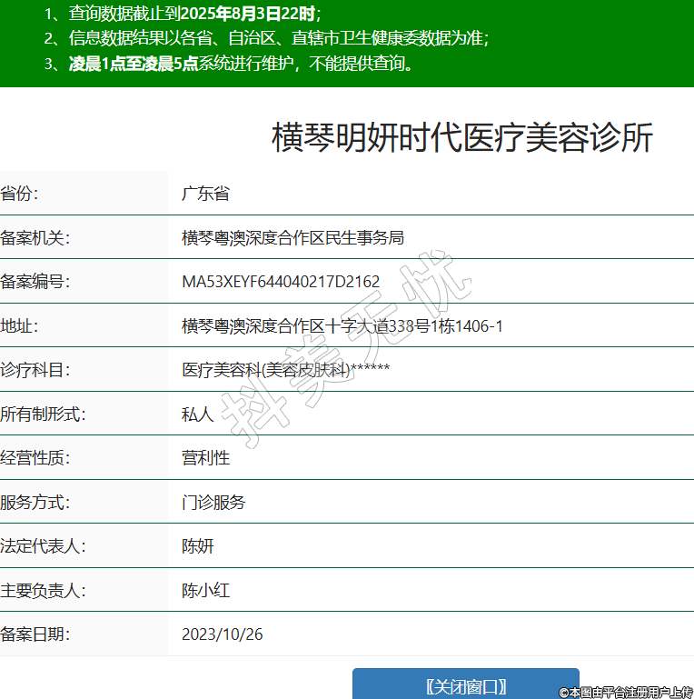 省份:廣東省備案機(jī)關(guān):橫琴粵澳深度合作區(qū)民生事務(wù)局備案編號(hào):MA53XEYF644040217D2162地址:橫琴粵澳深度合作區(qū)十字大道338號(hào)1棟1406-1診療科目:醫(yī)療美容科(美容皮膚科)******所有制形式:私人經(jīng)營(yíng)性質(zhì):營(yíng)利性服務(wù)方式:門診服務(wù)法定代表人:陳妍主要負(fù)責(zé)人:陳小紅備案日期:2023/10/26 -