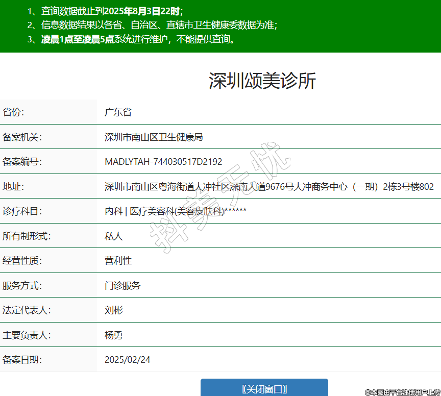 省份:廣東省備案機(jī)關(guān):深圳市南山區(qū)衛(wèi)生健康局備案編號(hào):MADLYTAH-744030517D2192地址:深圳市南山區(qū)粵海街道大沖社區(qū)深南大道9676號(hào)大沖商務(wù)中心(一期)2棟3號(hào)樓802診療科目:內(nèi)科 | 醫(yī)療美容科(美容皮膚科)******所有制形式:私人經(jīng)營(yíng)性質(zhì):營(yíng)利性服務(wù)方式:門診服務(wù)法定代表人:劉彬主要負(fù)責(zé)人:楊勇備案日期:2025/02/24 -