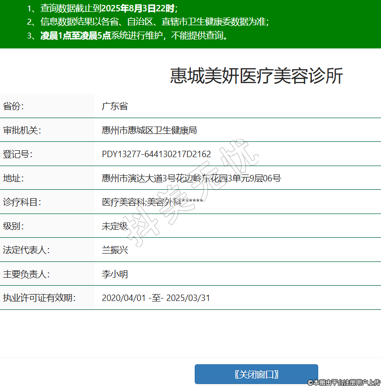 省份:廣東省審批機(jī)關(guān):惠州市惠城區(qū)衛(wèi)生健康局登記號(hào):PDY13277-644130217D2162地址:惠州市演達(dá)大道3號(hào)花邊嶺東花園3單元9層06號(hào)診療科目:醫(yī)療美容科;美容外科******級(jí)別:未定級(jí)法定代表人:蘭振興主要負(fù)責(zé)人:李小明執(zhí)業(yè)許可證有效期:2020/04/01 -至- 2025/03/31 -