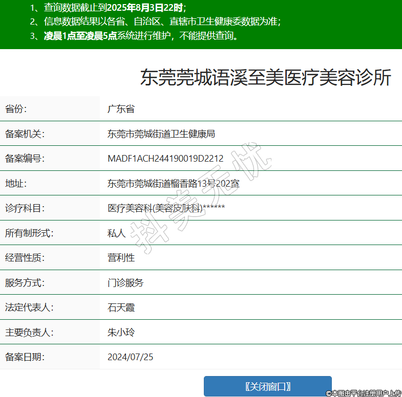 省份:廣東省備案機(jī)關(guān):東莞市莞城街道衛(wèi)生健康局備案編號:MADF1ACH244190019D2212地址:東莞市莞城街道榴香路13號202室診療科目:醫(yī)療美容科(美容皮膚科)******所有制形式:私人經(jīng)營性質(zhì):營利性服務(wù)方式:門診服務(wù)法定代表人:石天霞主要負(fù)責(zé)人:朱小玲備案日期:2024/07/25 -