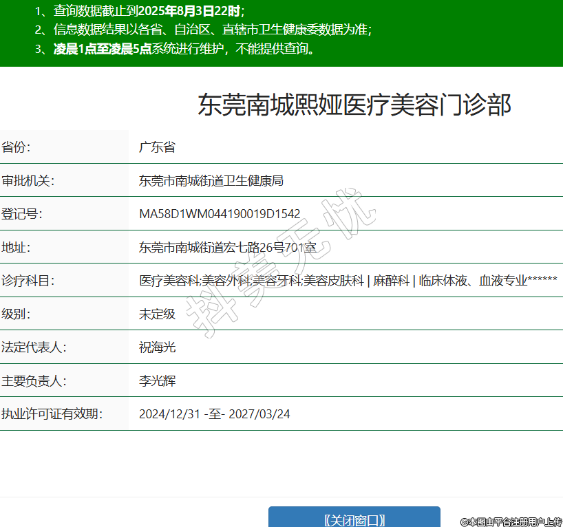 省份:廣東省審批機關:東莞市南城街道衛(wèi)生健康局登記號:MA58D1WM044190019D1542地址:東莞市南城街道宏七路26號701室診療科目:醫(yī)療美容科;美容外科;美容牙科;美容皮膚科 | 麻醉科 | 臨床體液、血液專業(yè)******級別:未定級法定代表人:祝海光主要負責人:李光輝執(zhí)業(yè)許可證有效期:2024/12/31 -至- 2027/03/24 -