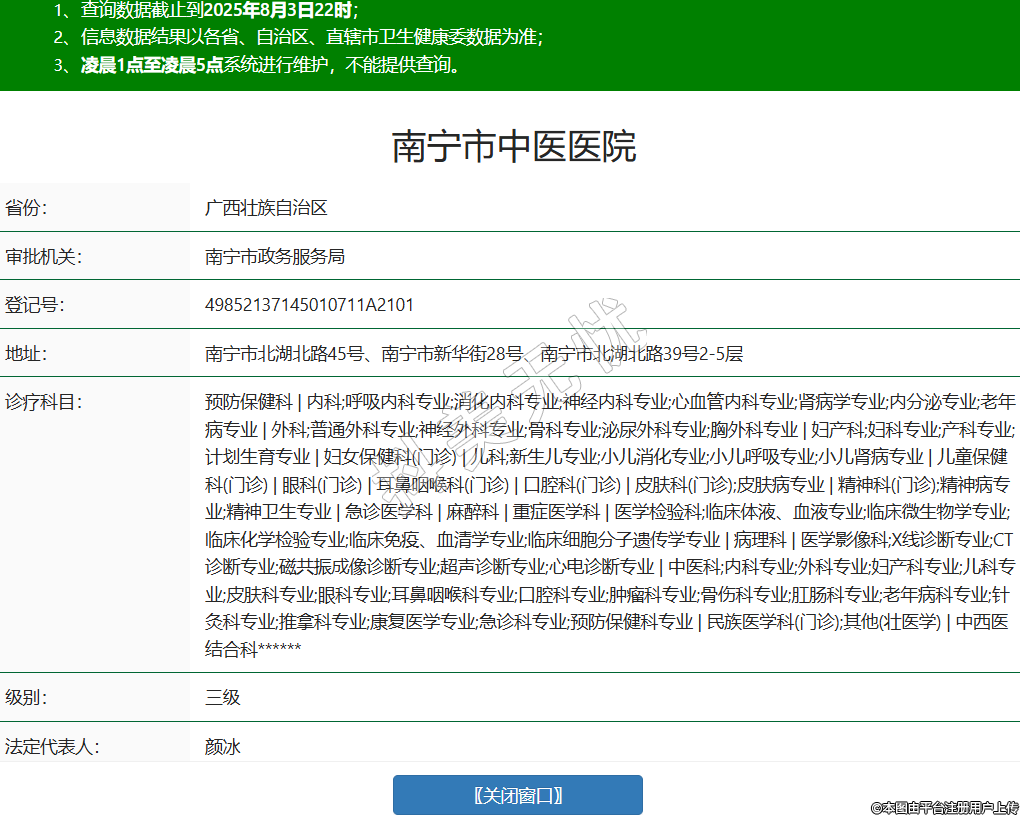 省份:廣西壯族自治區(qū)審批機(jī)關(guān):南寧市政務(wù)服務(wù)局登記號:49852137145010711A2101地址:南寧市北湖北路45號、南寧市新華街28號、南寧市北湖北路39號2-5層診療科目:預(yù)防保健科 | 內(nèi)科;呼吸內(nèi)科專業(yè);消化內(nèi)科專業(yè);神經(jīng)內(nèi)科專業(yè);心血管內(nèi)科專業(yè);腎病學(xué)專業(yè);內(nèi)分泌專業(yè);老年病專業(yè) | 外科;普通外科專業(yè);神經(jīng)外科專業(yè);骨科專業(yè);泌尿外科專業(yè);胸外科專業(yè) | 婦產(chǎn)科;婦科專業(yè);產(chǎn)科專業(yè);計劃生育專業(yè) | 婦女保健科(門診) | 兒科;新生兒專業(yè);小兒消化專業(yè);小兒呼吸專業(yè);小兒腎病專業(yè) | 兒童保健科(門診) | 眼科(門診) | 耳鼻咽喉科(門診) | 口腔科(門診) | 皮膚科(門診);皮膚病專業(yè) | 精神科(門診);精神病專業(yè);精神衛(wèi)生專業(yè) | 急診醫(yī)學(xué)科 | 麻醉科 | 重癥醫(yī)學(xué)科 | 醫(yī)學(xué)檢驗(yàn)科;臨床體液、血液專業(yè);臨床微生物學(xué)專業(yè);臨床化學(xué)檢驗(yàn)專業(yè);臨床免疫、血清學(xué)專業(yè);臨床細(xì)胞分子遺傳學(xué)專業(yè) | 病理科 | 醫(yī)學(xué)影像科;X線診斷專業(yè);CT診斷專業(yè);磁共振成像診斷專業(yè);超聲診斷專業(yè);心電診斷專業(yè) | 中醫(yī)科;內(nèi)科專業(yè);外科專業(yè);婦產(chǎn)科專業(yè);兒科專業(yè);皮膚科專業(yè);眼科專業(yè);耳鼻咽喉科專業(yè);口腔科專業(yè);腫瘤科專業(yè);骨傷科專業(yè);肛腸科專業(yè);老年病科專業(yè);針灸科專業(yè);推拿科專業(yè);康復(fù)醫(yī)學(xué)專業(yè);急診科專業(yè);預(yù)防保健科專業(yè) | 民族醫(yī)學(xué)科(門診);其他(壯醫(yī)學(xué)) | 中西醫(yī)結(jié)合科******級別:三級法定代表人:顏冰主要負(fù)責(zé)人:顏冰執(zhí)業(yè)許可證有效期:2025/07/16 -至- 2032/01/27 -