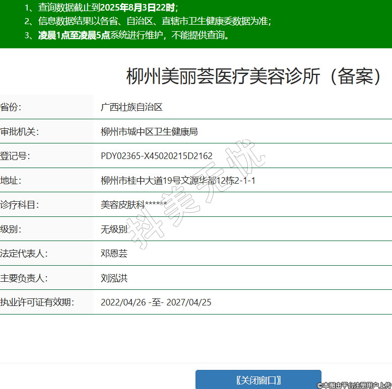 省份:廣西壯族自治區(qū)審批機關(guān):柳州市城中區(qū)衛(wèi)生健康局登記號:PDY02365-X45020215D2162地址:柳州市桂中大道19號文源華都12棟2-1-1診療科目:美容皮膚科******級別:無級別法定代表人:鄧恩蕓主要負(fù)責(zé)人:劉泓洪執(zhí)業(yè)許可證有效期:2022/04/26 -至- 2027/04/25 -