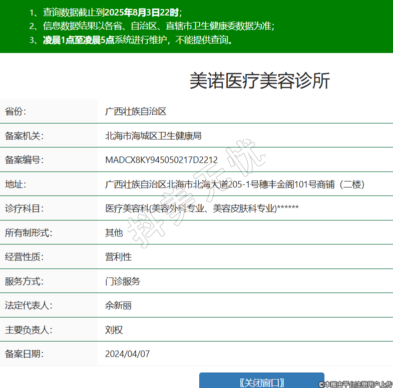 省份:廣西壯族自治區(qū)備案機關(guān):北海市海城區(qū)衛(wèi)生健康局備案編號:MADCX8KY945050217D2212地址:廣西壯族自治區(qū)北海市北海大道205-1號穗豐金閣101號商鋪(二樓)診療科目:醫(yī)療美容科(美容外科專業(yè)、美容皮膚科專業(yè))******所有制形式:其他經(jīng)營性質(zhì):營利性服務方式:門診服務法定代表人:余新麗主要負責人:劉權(quán)備案日期:2024/04/07 -