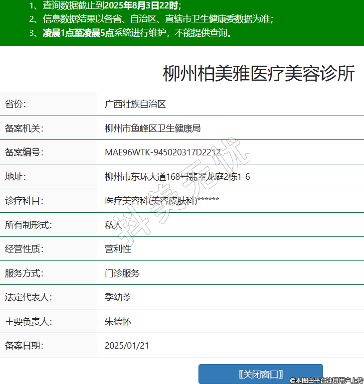 省份:廣西壯族自治區(qū)備案機關:柳州市魚峰區(qū)衛(wèi)生健康局備案編號:MAE96WTK-945020317D2212地址:柳州市東環(huán)大道168號翡翠龍庭2棟1-6診療科目:醫(yī)療美容科(美容皮膚科)******所有制形式:私人經(jīng)營性質:營利性服務方式:門診服務法定代表人:季幼苓主要負責人:朱德懷備案日期:2025/01/21 -