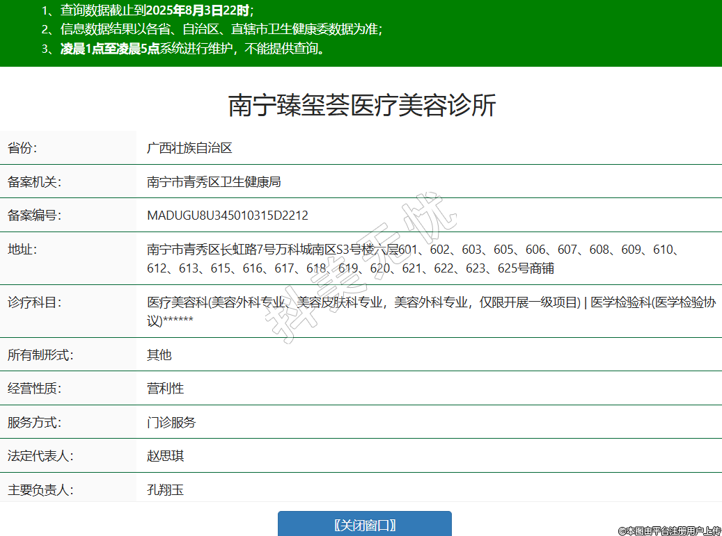 省份:廣西壯族自治區(qū)備案機(jī)關(guān):南寧市青秀區(qū)衛(wèi)生健康局備案編號(hào):MADUGU8U345010315D2212地址:南寧市青秀區(qū)長(zhǎng)虹路7號(hào)萬(wàn)科城南區(qū)S3號(hào)樓六層601、602、603、605、606、607、608、609、610、612、613、615、616、617、618、619、620、621、622、623、625號(hào)商鋪診療科目:醫(yī)療美容科(美容外科專(zhuān)業(yè)、美容皮膚科專(zhuān)業(yè),美容外科專(zhuān)業(yè),僅限開(kāi)展一級(jí)項(xiàng)目) | 醫(yī)學(xué)檢驗(yàn)科(醫(yī)學(xué)檢驗(yàn)協(xié)議)******所有制形式:其他經(jīng)營(yíng)性質(zhì):營(yíng)利性服務(wù)方式:門(mén)診服務(wù)法定代表人:趙思琪主要負(fù)責(zé)人:孔翔玉備案日期:2025/07/08 -