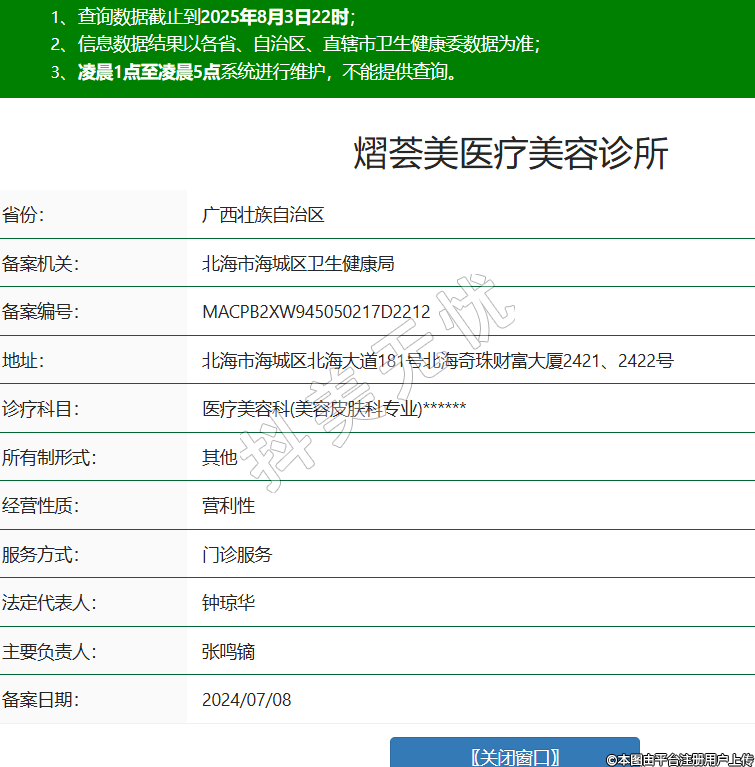 省份:廣西壯族自治區(qū)備案機(jī)關(guān):北海市海城區(qū)衛(wèi)生健康局備案編號(hào):MACPB2XW945050217D2212地址:北海市海城區(qū)北海大道181號(hào)北海奇珠財(cái)富大廈2421、2422號(hào)診療科目:醫(yī)療美容科(美容皮膚科專業(yè))******所有制形式:其他經(jīng)營性質(zhì):營利性服務(wù)方式:門診服務(wù)法定代表人:鐘瓊?cè)A主要負(fù)責(zé)人:張鳴鏑備案日期:2024/07/08 -