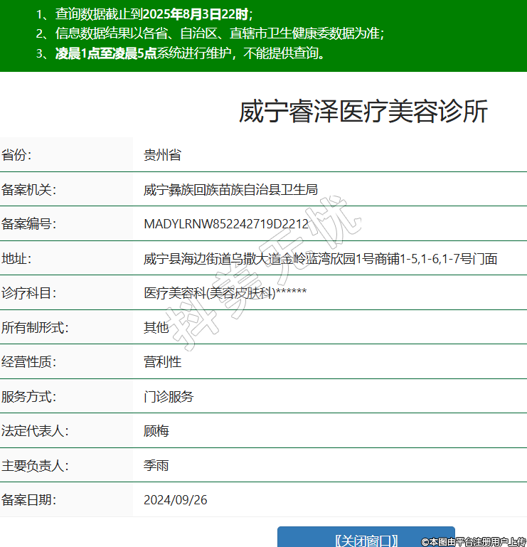 省份:貴州省備案機關:威寧彝族回族苗族自治縣衛(wèi)生局備案編號:MADYLRNW852242719D2212地址:威寧縣海邊街道烏撒大道金嶺藍灣欣園1號商鋪1-5,1-6,1-7號門面診療科目:醫(yī)療美容科(美容皮膚科)******所有制形式:其他經(jīng)營性質:營利性服務方式:門診服務法定代表人:顧梅主要負責人:季雨備案日期:2024/09/26 -