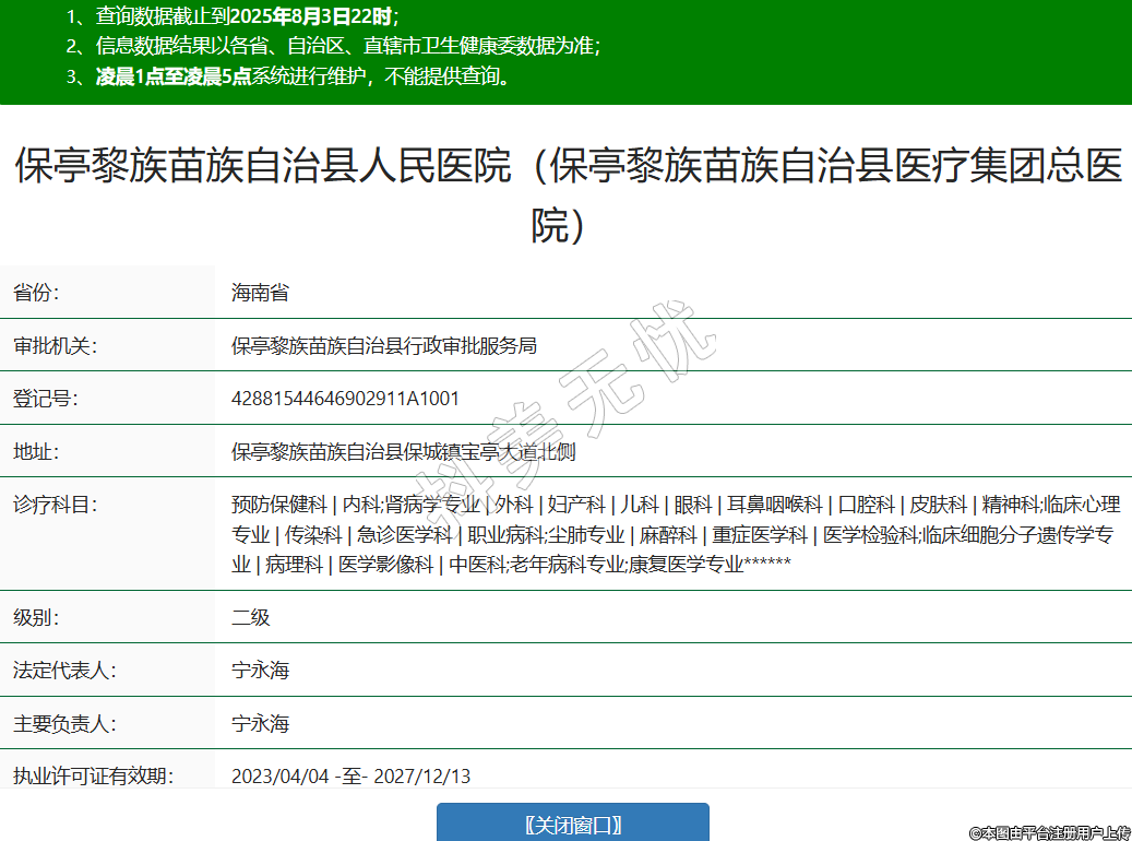 省份:海南省審批機(jī)關(guān):保亭黎族苗族自治縣行政審批服務(wù)局登記號(hào):42881544646902911A1001地址:保亭黎族苗族自治縣保城鎮(zhèn)寶亭大道北側(cè)診療科目:預(yù)防保健科 | 內(nèi)科;腎病學(xué)專業(yè) | 外科 | 婦產(chǎn)科 | 兒科 | 眼科 | 耳鼻咽喉科 | 口腔科 | 皮膚科 | 精神科;臨床心理專業(yè) | 傳染科 | 急診醫(yī)學(xué)科 | 職業(yè)病科;塵肺專業(yè) | 麻醉科 | 重癥醫(yī)學(xué)科 | 醫(yī)學(xué)檢驗(yàn)科;臨床細(xì)胞分子遺傳學(xué)專業(yè) | 病理科 | 醫(yī)學(xué)影像科 | 中醫(yī)科;老年病科專業(yè);康復(fù)醫(yī)學(xué)專業(yè)******級(jí)別:二級(jí)法定代表人:寧永海主要負(fù)責(zé)人:寧永海執(zhí)業(yè)許可證有效期:2023/04/04 -至- 2027/12/13 -