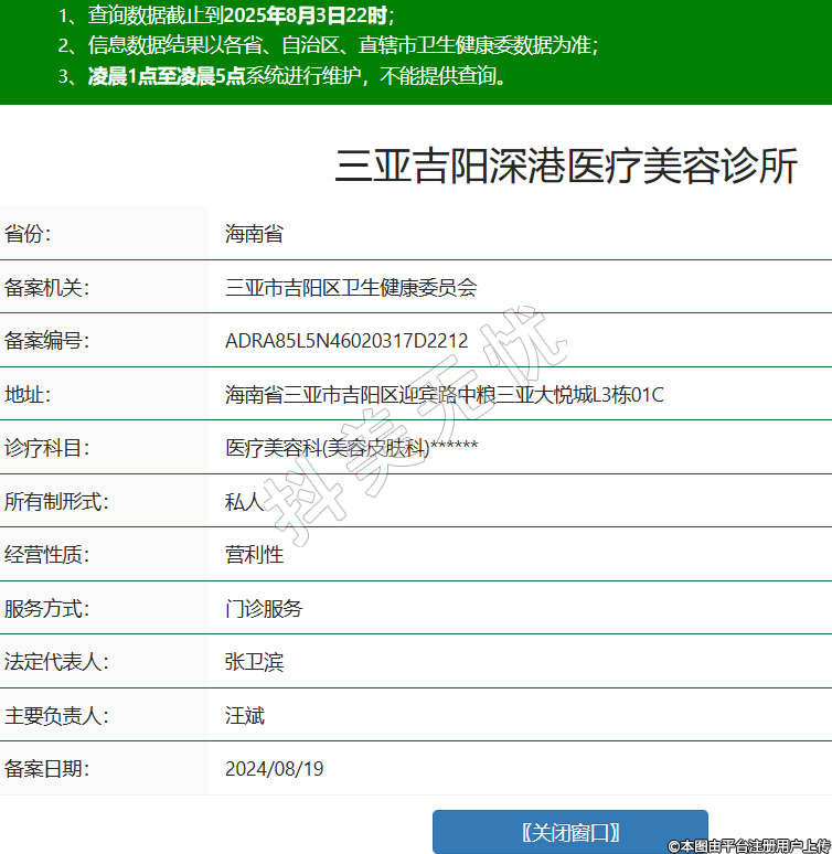 省份:海南省備案機關(guān):三亞市吉陽區(qū)衛(wèi)生健康委員會備案編號:ADRA85L5N46020317D2212地址:海南省三亞市吉陽區(qū)迎賓路中糧三亞大悅城L3棟01C診療科目:醫(yī)療美容科(美容皮膚科)******所有制形式:私人經(jīng)營性質(zhì):營利性服務(wù)方式:門診服務(wù)法定代表人:張衛(wèi)濱主要負(fù)責(zé)人:汪斌備案日期:2024/08/19 -