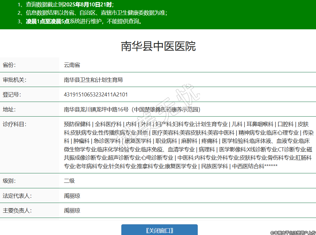 省份:云南省審批機(jī)關(guān):南華縣衛(wèi)生和計(jì)劃生育局登記號:43191510653232411A2101地址:南華縣龍川鎮(zhèn)龍坪中路16號(中國楚雄彝醫(yī)藥康養(yǎng)示范園)診療科目:預(yù)防保健科 | 全科醫(yī)療科 | 內(nèi)科 | 外科 | 婦產(chǎn)科;婦科專業(yè);計(jì)劃生育專業(yè) | 兒科 | 耳鼻咽喉科 | 口腔科 | 皮膚科;皮膚病專業(yè);性傳播疾病專業(yè);其他 | 醫(yī)療美容科;美容皮膚科;美容中醫(yī)科 | 精神病專業(yè);臨床心理專業(yè) | 傳染科 | 腫瘤科 | 急診醫(yī)學(xué)科 | 康復(fù)醫(yī)學(xué)科 | 職業(yè)病科 | 麻醉科 | 疼痛科 | 醫(yī)學(xué)檢驗(yàn)科;臨床體液、血液專業(yè);臨床微生物學(xué)專業(yè);臨床化學(xué)檢驗(yàn)專業(yè);臨床免疫、血清學(xué)專業(yè) | 病理科 | 醫(yī)學(xué)影像科;X線診斷專業(yè);CT診斷專業(yè);磁共振成像診斷專業(yè);超聲診斷專業(yè);心電診斷專業(yè) | 中醫(yī)科;內(nèi)科專業(yè);外科專業(yè);皮膚科專業(yè);骨傷科專業(yè);肛腸科專業(yè);老年病科專業(yè);針灸科專業(yè);推拿科專業(yè);康復(fù)醫(yī)學(xué)專業(yè) | 民族醫(yī)學(xué)科 | 中西醫(yī)結(jié)合科******級別:二級法定代表人:禹麗瓊主要負(fù)責(zé)人:禹麗瓊執(zhí)業(yè)許可證有效期:2025/04/16 -至- 2037/12/30 -