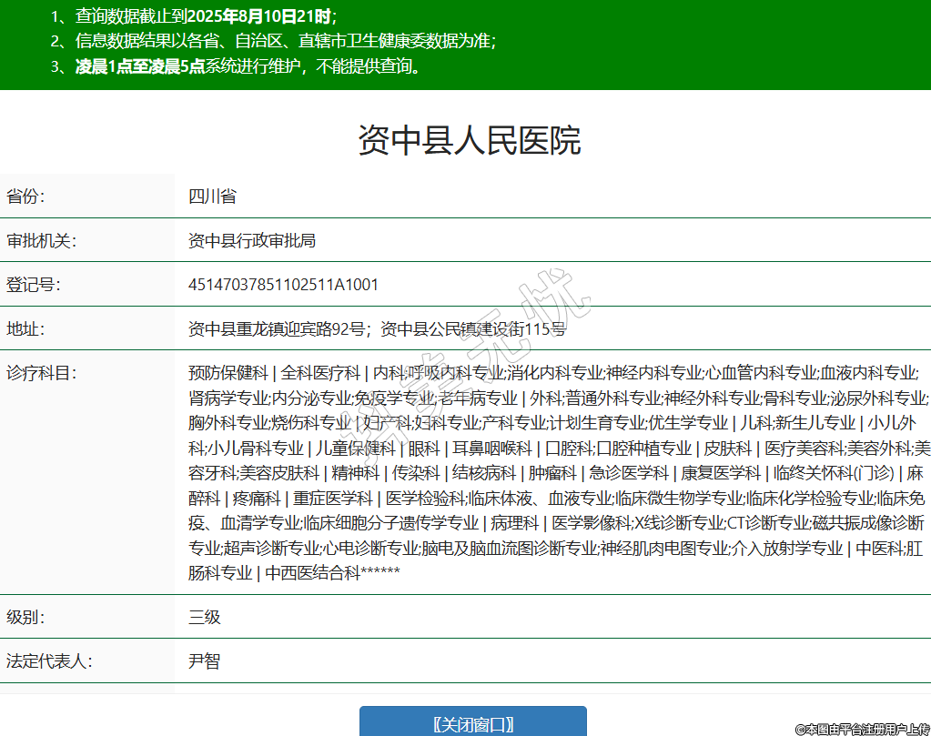 省份:四川省審批機(jī)關(guān):資中縣行政審批局登記號(hào):45147037851102511A1001地址:資中縣重龍鎮(zhèn)迎賓路92號(hào);資中縣公民鎮(zhèn)建設(shè)街115號(hào)診療科目:預(yù)防保健科 | 全科醫(yī)療科 | 內(nèi)科;呼吸內(nèi)科專業(yè);消化內(nèi)科專業(yè);神經(jīng)內(nèi)科專業(yè);心血管內(nèi)科專業(yè);血液內(nèi)科專業(yè);腎病學(xué)專業(yè);內(nèi)分泌專業(yè);免疫學(xué)專業(yè);老年病專業(yè) | 外科;普通外科專業(yè);神經(jīng)外科專業(yè);骨科專業(yè);泌尿外科專業(yè);胸外科專業(yè);燒傷科專業(yè) | 婦產(chǎn)科;婦科專業(yè);產(chǎn)科專業(yè);計(jì)劃生育專業(yè);優(yōu)生學(xué)專業(yè) | 兒科;新生兒專業(yè) | 小兒外科;小兒骨科專業(yè) | 兒童保健科 | 眼科 | 耳鼻咽喉科 | 口腔科;口腔種植專業(yè) | 皮膚科 | 醫(yī)療美容科;美容外科;美容牙科;美容皮膚科 | 精神科 | 傳染科 | 結(jié)核病科 | 腫瘤科 | 急診醫(yī)學(xué)科 | 康復(fù)醫(yī)學(xué)科 | 臨終關(guān)懷科(門診) | 麻醉科 | 疼痛科 | 重癥醫(yī)學(xué)科 | 醫(yī)學(xué)檢驗(yàn)科;臨床體液、血液專業(yè);臨床微生物學(xué)專業(yè);臨床化學(xué)檢驗(yàn)專業(yè);臨床免疫、血清學(xué)專業(yè);臨床細(xì)胞分子遺傳學(xué)專業(yè) | 病理科 | 醫(yī)學(xué)影像科;X線診斷專業(yè);CT診斷專業(yè);磁共振成像診斷專業(yè);超聲診斷專業(yè);心電診斷專業(yè);腦電及腦血流圖診斷專業(yè);神經(jīng)肌肉電圖專業(yè);介入放射學(xué)專業(yè) | 中醫(yī)科;肛腸科專業(yè) | 中西醫(yī)結(jié)合科******級(jí)別:三級(jí)法定代表人:尹智主要負(fù)責(zé)人:尹智執(zhí)業(yè)許可證有效期:2025/07/28 -至- 2030/12/31 -