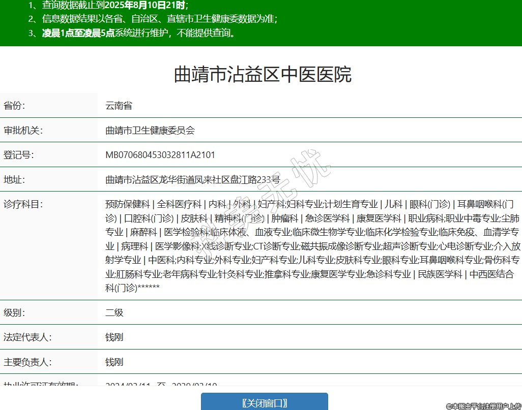 省份:云南省審批機(jī)關(guān):曲靖市衛(wèi)生健康委員會(huì)登記號(hào):MB070680453032811A2101地址:曲靖市沾益區(qū)龍華街道鳳來(lái)社區(qū)盤(pán)江路233號(hào)診療科目:預(yù)防保健科 | 全科醫(yī)療科 | 內(nèi)科 | 外科 | 婦產(chǎn)科;婦科專(zhuān)業(yè);計(jì)劃生育專(zhuān)業(yè) | 兒科 | 眼科(門(mén)診) | 耳鼻咽喉科(門(mén)診) | 口腔科(門(mén)診) | 皮膚科 | 精神科(門(mén)診) | 腫瘤科 | 急診醫(yī)學(xué)科 | 康復(fù)醫(yī)學(xué)科 | 職業(yè)病科;職業(yè)中毒專(zhuān)業(yè);塵肺專(zhuān)業(yè) | 麻醉科 | 醫(yī)學(xué)檢驗(yàn)科;臨床體液、血液專(zhuān)業(yè);臨床微生物學(xué)專(zhuān)業(yè);臨床化學(xué)檢驗(yàn)專(zhuān)業(yè);臨床免疫、血清學(xué)專(zhuān)業(yè) | 病理科 | 醫(yī)學(xué)影像科;X線(xiàn)診斷專(zhuān)業(yè);CT診斷專(zhuān)業(yè);磁共振成像診斷專(zhuān)業(yè);超聲診斷專(zhuān)業(yè);心電診斷專(zhuān)業(yè);介入放射學(xué)專(zhuān)業(yè) | 中醫(yī)科;內(nèi)科專(zhuān)業(yè);外科專(zhuān)業(yè);婦產(chǎn)科專(zhuān)業(yè);兒科專(zhuān)業(yè);皮膚科專(zhuān)業(yè);眼科專(zhuān)業(yè);耳鼻咽喉科專(zhuān)業(yè);骨傷科專(zhuān)業(yè);肛腸科專(zhuān)業(yè);老年病科專(zhuān)業(yè);針灸科專(zhuān)業(yè);推拿科專(zhuān)業(yè);康復(fù)醫(yī)學(xué)專(zhuān)業(yè);急診科專(zhuān)業(yè) | 民族醫(yī)學(xué)科 | 中西醫(yī)結(jié)合科(門(mén)診)******級(jí)別:二級(jí)法定代表人:錢(qián)剛主要負(fù)責(zé)人:錢(qián)剛執(zhí)業(yè)許可證有效期:2024/03/11 -至- 2039/03/10 -