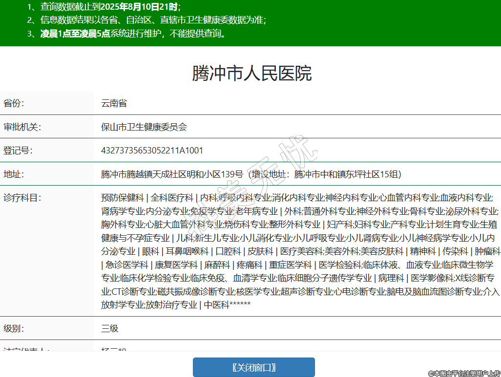 省份:云南省審批機(jī)關(guān):保山市衛(wèi)生健康委員會登記號:43273735653052211A1001地址:騰沖市騰越鎮(zhèn)天成社區(qū)明和小區(qū)139號(增設(shè)地址:騰沖市中和鎮(zhèn)東坪社區(qū)15組)診療科目:預(yù)防保健科 | 全科醫(yī)療科 | 內(nèi)科;呼吸內(nèi)科專業(yè);消化內(nèi)科專業(yè);神經(jīng)內(nèi)科專業(yè);心血管內(nèi)科專業(yè);血液內(nèi)科專業(yè);腎病學(xué)專業(yè);內(nèi)分泌專業(yè);免疫學(xué)專業(yè);老年病專業(yè) | 外科;普通外科專業(yè);神經(jīng)外科專業(yè);骨科專業(yè);泌尿外科專業(yè);胸外科專業(yè);心臟大血管外科專業(yè);燒傷科專業(yè);整形外科專業(yè) | 婦產(chǎn)科;婦科專業(yè);產(chǎn)科專業(yè);計(jì)劃生育專業(yè);生殖健康與不孕癥專業(yè) | 兒科;新生兒專業(yè);小兒消化專業(yè);小兒呼吸專業(yè);小兒腎病專業(yè);小兒神經(jīng)病學(xué)專業(yè);小兒內(nèi)分泌專業(yè) | 眼科 | 耳鼻咽喉科 | 口腔科 | 皮膚科 | 醫(yī)療美容科;美容外科;美容皮膚科 | 精神科 | 傳染科 | 腫瘤科 | 急診醫(yī)學(xué)科 | 康復(fù)醫(yī)學(xué)科 | 麻醉科 | 疼痛科 | 重癥醫(yī)學(xué)科 | 醫(yī)學(xué)檢驗(yàn)科;臨床體液、血液專業(yè);臨床微生物學(xué)專業(yè);臨床化學(xué)檢驗(yàn)專業(yè);臨床免疫、血清學(xué)專業(yè);臨床細(xì)胞分子遺傳學(xué)專業(yè) | 病理科 | 醫(yī)學(xué)影像科;X線診斷專業(yè);CT診斷專業(yè);磁共振成像診斷專業(yè);核醫(yī)學(xué)專業(yè);超聲診斷專業(yè);心電診斷專業(yè);腦電及腦血流圖診斷專業(yè);介入放射學(xué)專業(yè);放射治療專業(yè) | 中醫(yī)科******級別:三級法定代表人:楊元松主要負(fù)責(zé)人:楊元松執(zhí)業(yè)許可證有效期:2025/02/24 -至- 2036/11/01 -