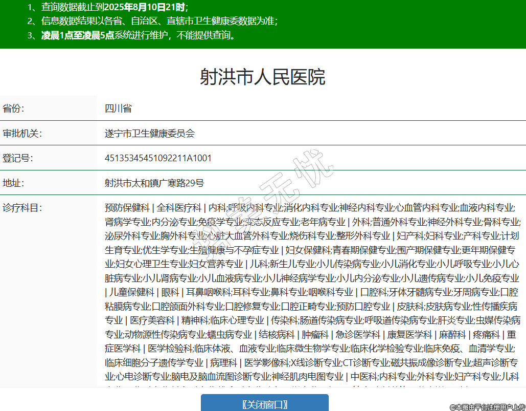 省份:四川省審批機(jī)關(guān):遂寧市衛(wèi)生健康委員會(huì)登記號(hào):45135345451092211A1001地址:射洪市太和鎮(zhèn)廣寒路29號(hào)診療科目:預(yù)防保健科 | 全科醫(yī)療科 | 內(nèi)科;呼吸內(nèi)科專業(yè);消化內(nèi)科專業(yè);神經(jīng)內(nèi)科專業(yè);心血管內(nèi)科專業(yè);血液內(nèi)科專業(yè);腎病學(xué)專業(yè);內(nèi)分泌專業(yè);免疫學(xué)專業(yè);變態(tài)反應(yīng)專業(yè);老年病專業(yè) | 外科;普通外科專業(yè);神經(jīng)外科專業(yè);骨科專業(yè);泌尿外科專業(yè);胸外科專業(yè);心臟大血管外科專業(yè);燒傷科專業(yè);整形外科專業(yè) | 婦產(chǎn)科;婦科專業(yè);產(chǎn)科專業(yè);計(jì)劃生育專業(yè);優(yōu)生學(xué)專業(yè);生殖健康與不孕癥專業(yè) | 婦女保健科;青春期保健專業(yè);圍產(chǎn)期保健專業(yè);更年期保健專業(yè);婦女心理衛(wèi)生專業(yè);婦女營(yíng)養(yǎng)專業(yè) | 兒科;新生兒專業(yè);小兒傳染病專業(yè);小兒消化專業(yè);小兒呼吸專業(yè);小兒心臟病專業(yè);小兒腎病專業(yè);小兒血液病專業(yè);小兒神經(jīng)病學(xué)專業(yè);小兒內(nèi)分泌專業(yè);小兒遺傳病專業(yè);小兒免疫專業(yè) | 兒童保健科 | 眼科 | 耳鼻咽喉科;耳科專業(yè);鼻科專業(yè);咽喉科專業(yè) | 口腔科;牙體牙髓病專業(yè);牙周病專業(yè);口腔粘膜病專業(yè);口腔頜面外科專業(yè);口腔修復(fù)專業(yè);口腔正畸專業(yè);預(yù)防口腔專業(yè) | 皮膚科;皮膚病專業(yè);性傳播疾病專業(yè) | 醫(yī)療美容科 | 精神科;臨床心理專業(yè) | 傳染科;腸道傳染病專業(yè);呼吸道傳染病專業(yè);肝炎專業(yè);蟲(chóng)媒傳染病專業(yè);動(dòng)物源性傳染病專業(yè);蠕蟲(chóng)病專業(yè) | 結(jié)核病科 | 腫瘤科 | 急診醫(yī)學(xué)科 | 康復(fù)醫(yī)學(xué)科 | 麻醉科 | 疼痛科 | 重癥醫(yī)學(xué)科 | 醫(yī)學(xué)檢驗(yàn)科;臨床體液、血液專業(yè);臨床微生物學(xué)專業(yè);臨床化學(xué)檢驗(yàn)專業(yè);臨床免疫、血清學(xué)專業(yè);臨床細(xì)胞分子遺傳學(xué)專業(yè) | 病理科 | 醫(yī)學(xué)影像科;X線診斷專業(yè);CT診斷專業(yè);磁共振成像診斷專業(yè);超聲診斷專業(yè);心電診斷專業(yè);腦電及腦血流圖診斷專業(yè);神經(jīng)肌肉電圖專業(yè) | 中醫(yī)科;內(nèi)科專業(yè);外科專業(yè);婦產(chǎn)科專業(yè);兒科專業(yè);骨傷科專業(yè);針灸科專業(yè);推拿科專業(yè);康復(fù)醫(yī)學(xué)專業(yè) | 中西醫(yī)結(jié)合科(其他許可信息詳見(jiàn)副本)******級(jí)別:三級(jí)法定代表人:謝莉主要負(fù)責(zé)人:謝莉執(zhí)業(yè)許可證有效期:2011/01/01 -至- 2025/12/31 -
