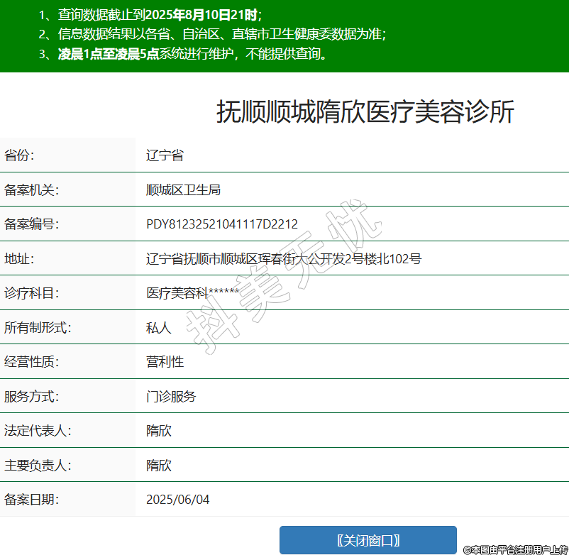 省份:遼寧省備案機(jī)關(guān):順城區(qū)衛(wèi)生局備案編號(hào):PDY81232521041117D2212地址:遼寧省撫順市順城區(qū)琿春街大公開(kāi)發(fā)2號(hào)樓北102號(hào)診療科目:醫(yī)療美容科******所有制形式:私人經(jīng)營(yíng)性質(zhì):營(yíng)利性服務(wù)方式:門(mén)診服務(wù)法定代表人:隋欣主要負(fù)責(zé)人:隋欣備案日期:2025/06/04 -