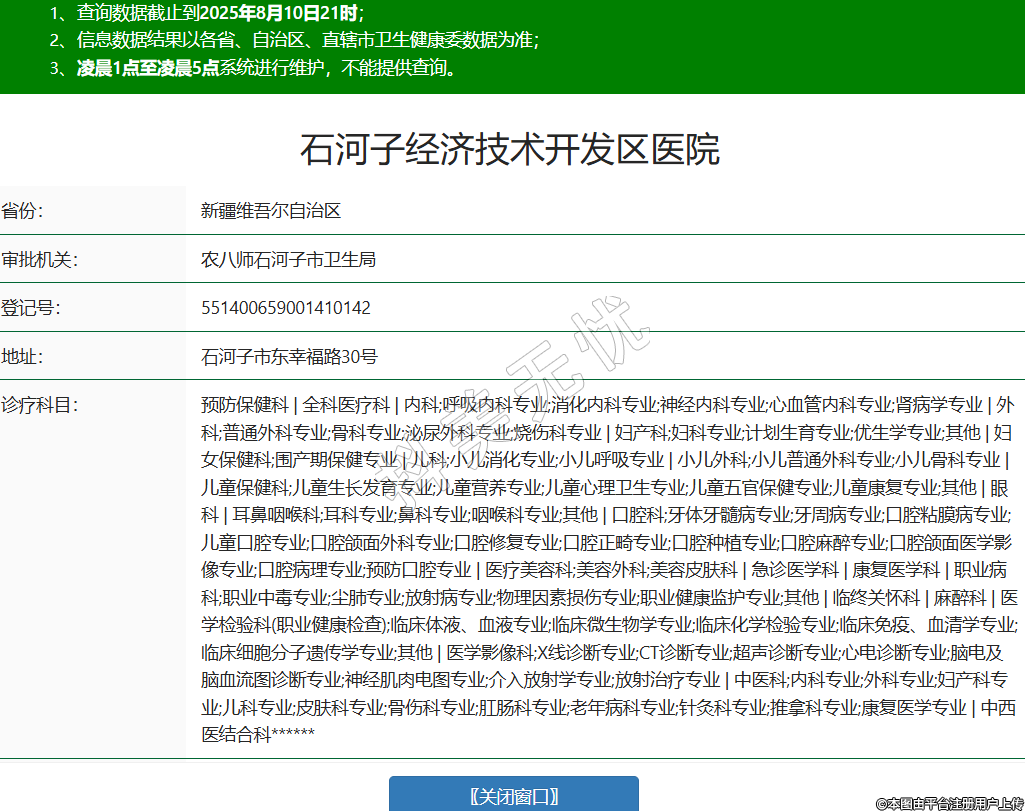 省份:新疆維吾爾自治區(qū)審批機關(guān):農(nóng)八師石河子市衛(wèi)生局登記號:551400659001410142地址:石河子市東幸福路30號診療科目:預(yù)防保健科 | 全科醫(yī)療科 | 內(nèi)科;呼吸內(nèi)科專業(yè);消化內(nèi)科專業(yè);神經(jīng)內(nèi)科專業(yè);心血管內(nèi)科專業(yè);腎病學(xué)專業(yè) | 外科;普通外科專業(yè);骨科專業(yè);泌尿外科專業(yè);燒傷科專業(yè) | 婦產(chǎn)科;婦科專業(yè);計劃生育專業(yè);優(yōu)生學(xué)專業(yè);其他 | 婦女保健科;圍產(chǎn)期保健專業(yè) | 兒科;小兒消化專業(yè);小兒呼吸專業(yè) | 小兒外科;小兒普通外科專業(yè);小兒骨科專業(yè) | 兒童保健科;兒童生長發(fā)育專業(yè);兒童營養(yǎng)專業(yè);兒童心理衛(wèi)生專業(yè);兒童五官保健專業(yè);兒童康復(fù)專業(yè);其他 | 眼科 | 耳鼻咽喉科;耳科專業(yè);鼻科專業(yè);咽喉科專業(yè);其他 | 口腔科;牙體牙髓病專業(yè);牙周病專業(yè);口腔粘膜病專業(yè);兒童口腔專業(yè);口腔頜面外科專業(yè);口腔修復(fù)專業(yè);口腔正畸專業(yè);口腔種植專業(yè);口腔麻醉專業(yè);口腔頜面醫(yī)學(xué)影像專業(yè);口腔病理專業(yè);預(yù)防口腔專業(yè) | 醫(yī)療美容科;美容外科;美容皮膚科 | 急診醫(yī)學(xué)科 | 康復(fù)醫(yī)學(xué)科 | 職業(yè)病科;職業(yè)中毒專業(yè);塵肺專業(yè);放射病專業(yè);物理因素損傷專業(yè);職業(yè)健康監(jiān)護專業(yè);其他 | 臨終關(guān)懷科 | 麻醉科 | 醫(yī)學(xué)檢驗科(職業(yè)健康檢查);臨床體液、血液專業(yè);臨床微生物學(xué)專業(yè);臨床化學(xué)檢驗專業(yè);臨床免疫、血清學(xué)專業(yè);臨床細胞分子遺傳學(xué)專業(yè);其他 | 醫(yī)學(xué)影像科;X線診斷專業(yè);CT診斷專業(yè);超聲診斷專業(yè);心電診斷專業(yè);腦電及腦血流圖診斷專業(yè);神經(jīng)肌肉電圖專業(yè);介入放射學(xué)專業(yè);放射治療專業(yè) | 中醫(yī)科;內(nèi)科專業(yè);外科專業(yè);婦產(chǎn)科專業(yè);兒科專業(yè);皮膚科專業(yè);骨傷科專業(yè);肛腸科專業(yè);老年病科專業(yè);針灸科專業(yè);推拿科專業(yè);康復(fù)醫(yī)學(xué)專業(yè) | 中西醫(yī)結(jié)合科******級別:二級法定代表人:王彥主要負責(zé)人:王彥執(zhí)業(yè)許可證有效期:2021/08/10 -至- 2027/08/09 -