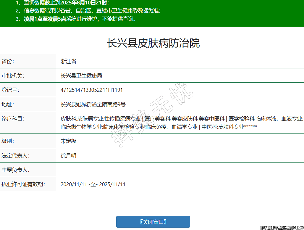 長興縣皮膚病防治院,診療科目:皮膚科;皮膚病專業(yè);性傳播疾病專業(yè) | 醫(yī)療美容科;美容皮膚科;美容中醫(yī)科 | 醫(yī)學檢驗科;臨床體液、血液專業(yè);臨床微生物學專業(yè);臨床化學檢驗專業(yè);臨床免疫、血清學專業(yè) | 中醫(yī)科;皮膚科專業(yè)******