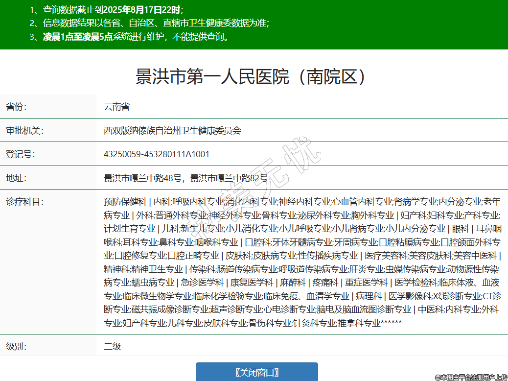 省份:云南省審批機(jī)關(guān):西雙版納傣族自治州衛(wèi)生健康委員會(huì)登記號(hào):43250059-453280111A1001地址:景洪市嘎蘭中路48號(hào),景洪市嘎蘭中路82號(hào)診療科目:預(yù)防保健科 | 內(nèi)科;呼吸內(nèi)科專業(yè);消化內(nèi)科專業(yè);神經(jīng)內(nèi)科專業(yè);心血管內(nèi)科專業(yè);腎病學(xué)專業(yè);內(nèi)分泌專業(yè);老年病專業(yè) | 外科;普通外科專業(yè);神經(jīng)外科專業(yè);骨科專業(yè);泌尿外科專業(yè);胸外科專業(yè) | 婦產(chǎn)科;婦科專業(yè);產(chǎn)科專業(yè);計(jì)劃生育專業(yè) | 兒科;新生兒專業(yè);小兒消化專業(yè);小兒呼吸專業(yè);小兒腎病專業(yè);小兒內(nèi)分泌專業(yè) | 眼科 | 耳鼻咽喉科;耳科專業(yè);鼻科專業(yè);咽喉科專業(yè) | 口腔科;牙體牙髓病專業(yè);牙周病專業(yè);口腔粘膜病專業(yè);口腔頜面外科專業(yè);口腔修復(fù)專業(yè);口腔正畸專業(yè) | 皮膚科;皮膚病專業(yè);性傳播疾病專業(yè) | 醫(yī)療美容科;美容皮膚科;美容中醫(yī)科 | 精神科;精神衛(wèi)生專業(yè) | 傳染科;腸道傳染病專業(yè);呼吸道傳染病專業(yè);肝炎專業(yè);蟲媒傳染病專業(yè);動(dòng)物源性傳染病專業(yè);蠕蟲病專業(yè) | 急診醫(yī)學(xué)科 | 康復(fù)醫(yī)學(xué)科 | 麻醉科 | 疼痛科 | 重癥醫(yī)學(xué)科 | 醫(yī)學(xué)檢驗(yàn)科;臨床體液、血液專業(yè);臨床微生物學(xué)專業(yè);臨床化學(xué)檢驗(yàn)專業(yè);臨床免疫、血清學(xué)專業(yè) | 病理科 | 醫(yī)學(xué)影像科;X線診斷專業(yè);CT診斷專業(yè);磁共振成像診斷專業(yè);超聲診斷專業(yè);心電診斷專業(yè);腦電及腦血流圖診斷專業(yè) | 中醫(yī)科;內(nèi)科專業(yè);外科專業(yè);婦產(chǎn)科專業(yè);兒科專業(yè);皮膚科專業(yè);骨傷科專業(yè);針灸科專業(yè);推拿科專業(yè)******級(jí)別:二級(jí)法定代表人:段世澤主要負(fù)責(zé)人:段家鏡執(zhí)業(yè)許可證有效期:2024/08/29 -至- 2038/09/18 -