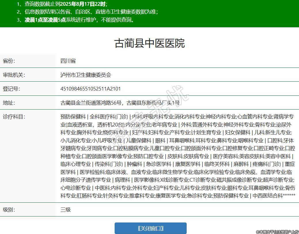 省份:四川省審批機(jī)關(guān):瀘州市衛(wèi)生健康委員會(huì)登記號(hào):45109846551052511A2101地址:古藺縣金蘭街道落鴻路56號(hào),古藺縣東新街馬廠頭1號(hào)診療科目:預(yù)防保健科 | 全科醫(yī)療科(門(mén)診) | 內(nèi)科;呼吸內(nèi)科專業(yè);消化內(nèi)科專業(yè);神經(jīng)內(nèi)科專業(yè);心血管內(nèi)科專業(yè);腎病學(xué)專業(yè)(血液透析室,透析機(jī)20臺(tái));內(nèi)分泌專業(yè);老年病專業(yè) | 外科;普通外科專業(yè);神經(jīng)外科專業(yè);骨科專業(yè);泌尿外科專業(yè);胸外科專業(yè);燒傷科專業(yè) | 婦產(chǎn)科;婦科專業(yè);產(chǎn)科專業(yè);計(jì)劃生育專業(yè) | 婦女保健科 | 兒科;新生兒專業(yè);小兒消化專業(yè);小兒呼吸專業(yè) | 兒童保健科 | 眼科 | 耳鼻咽喉科;耳科專業(yè);鼻科專業(yè);咽喉科專業(yè) | 口腔科;牙體牙髓病專業(yè);牙周病專業(yè);口腔粘膜病專業(yè);兒童口腔專業(yè);口腔頜面外科專業(yè);口腔修復(fù)專業(yè);口腔正畸專業(yè);口腔種植專業(yè);口腔頜面醫(yī)學(xué)影像專業(yè);預(yù)防口腔專業(yè) | 皮膚科;皮膚病專業(yè) | 醫(yī)療美容科;美容皮膚科;美容中醫(yī)科 | 臨床心理專業(yè) | 傳染科(門(mén)診) | 腫瘤科 | 急診醫(yī)學(xué)科 | 康復(fù)醫(yī)學(xué)科 | 臨終關(guān)懷科 | 麻醉科 | 疼痛科(門(mén)診) | 重癥醫(yī)學(xué)科 | 醫(yī)學(xué)檢驗(yàn)科;臨床體液、血液專業(yè);臨床微生物學(xué)專業(yè);臨床化學(xué)檢驗(yàn)專業(yè);臨床免疫、血清學(xué)專業(yè);臨床細(xì)胞分子遺傳學(xué)專業(yè) | 病理科 | 醫(yī)學(xué)影像科;X線診斷專業(yè);CT診斷專業(yè);磁共振成像診斷專業(yè);超聲診斷專業(yè);心電診斷專業(yè) | 中醫(yī)科;內(nèi)科專業(yè);外科專業(yè);婦產(chǎn)科專業(yè);兒科專業(yè);皮膚科專業(yè);眼科專業(yè);耳鼻咽喉科專業(yè);骨傷科專業(yè);肛腸科專業(yè);針灸科專業(yè);推拿科專業(yè);康復(fù)醫(yī)學(xué)專業(yè);急診科專業(yè);預(yù)防保健科專業(yè) | 中西醫(yī)結(jié)合科******級(jí)別:三級(jí)法定代表人:王澤琛主要負(fù)責(zé)人:王澤琛執(zhí)業(yè)許可證有效期:2022/11/23 -至- 2030/12/31 -