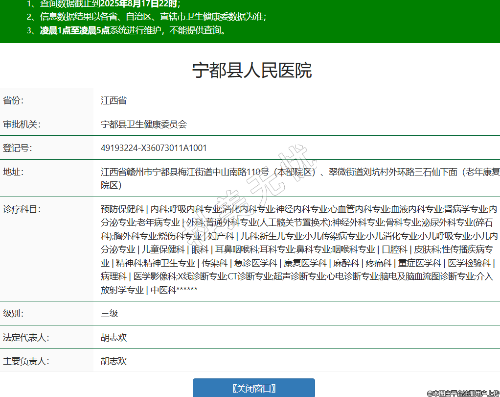 省份:江西省審批機關:寧都縣衛(wèi)生健康委員會登記號:49193224-X36073011A1001地址:江西省贛州市寧都縣梅江街道中山南路110號(本部院區(qū))、翠微街道劉坑村外環(huán)路三石仙下面(老年康復院區(qū))診療科目:預防保健科 | 內(nèi)科;呼吸內(nèi)科專業(yè);消化內(nèi)科專業(yè);神經(jīng)內(nèi)科專業(yè);心血管內(nèi)科專業(yè);血液內(nèi)科專業(yè);腎病學專業(yè);內(nèi)分泌專業(yè);老年病專業(yè) | 外科;普通外科專業(yè)(人工髖關節(jié)置換術);神經(jīng)外科專業(yè);骨科專業(yè);泌尿外科專業(yè)(碎石科);胸外科專業(yè);燒傷科專業(yè) | 婦產(chǎn)科 | 兒科;新生兒專業(yè);小兒傳染病專業(yè);小兒消化專業(yè);小兒呼吸專業(yè);小兒內(nèi)分泌專業(yè) | 兒童保健科 | 眼科 | 耳鼻咽喉科;耳科專業(yè);鼻科專業(yè);咽喉科專業(yè) | 口腔科 | 皮膚科;性傳播疾病專業(yè) | 精神科;精神衛(wèi)生專業(yè) | 傳染科 | 急診醫(yī)學科 | 康復醫(yī)學科 | 麻醉科 | 疼痛科 | 重癥醫(yī)學科 | 醫(yī)學檢驗科 | 病理科 | 醫(yī)學影像科;X線診斷專業(yè);CT診斷專業(yè);超聲診斷專業(yè);心電診斷專業(yè);腦電及腦血流圖診斷專業(yè);介入放射學專業(yè) | 中醫(yī)科******級別:三級法定代表人:胡志歡主要負責人:胡志歡執(zhí)業(yè)許可證有效期:2025/08/01 -至- 2028/07/31 -