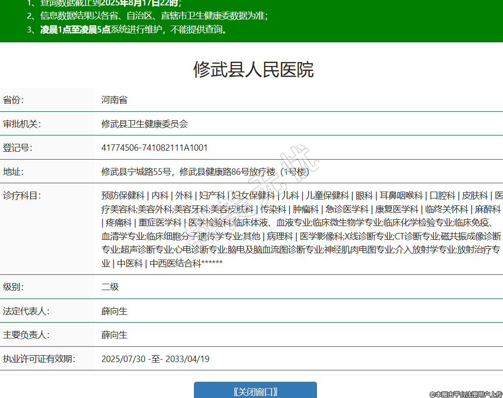 省份:河南省審批機(jī)關(guān):修武縣衛(wèi)生健康委員會(huì)登記號(hào):41774506-741082111A1001地址:修武縣寧城路55號(hào),修武縣健康路86號(hào)放療樓(1號(hào)樓)診療科目:預(yù)防保健科 | 內(nèi)科 | 外科 | 婦產(chǎn)科 | 婦女保健科 | 兒科 | 兒童保健科 | 眼科 | 耳鼻咽喉科 | 口腔科 | 皮膚科 | 醫(yī)療美容科;美容外科;美容牙科;美容皮膚科 | 傳染科 | 腫瘤科 | 急診醫(yī)學(xué)科 | 康復(fù)醫(yī)學(xué)科 | 臨終關(guān)懷科 | 麻醉科 | 疼痛科 | 重癥醫(yī)學(xué)科 | 醫(yī)學(xué)檢驗(yàn)科;臨床體液、血液專業(yè);臨床微生物學(xué)專業(yè);臨床化學(xué)檢驗(yàn)專業(yè);臨床免疫、血清學(xué)專業(yè);臨床細(xì)胞分子遺傳學(xué)專業(yè);其他 | 病理科 | 醫(yī)學(xué)影像科;X線診斷專業(yè);CT診斷專業(yè);磁共振成像診斷專業(yè);超聲診斷專業(yè);心電診斷專業(yè);腦電及腦血流圖診斷專業(yè);神經(jīng)肌肉電圖專業(yè);介入放射學(xué)專業(yè);放射治療專業(yè) | 中醫(yī)科 | 中西醫(yī)結(jié)合科******級(jí)別:二級(jí)法定代表人:薛向生主要負(fù)責(zé)人:薛向生執(zhí)業(yè)許可證有效期:2025/07/30 -至- 2033/04/19 -