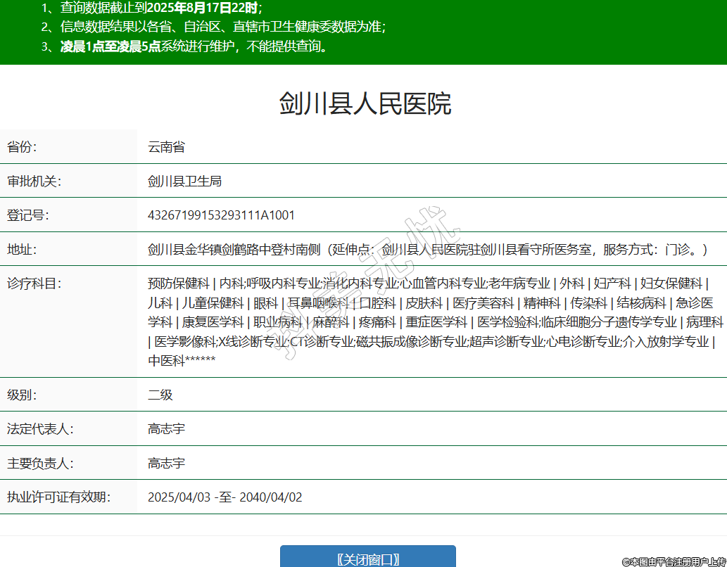 省份:云南省審批機關:劍川縣衛(wèi)生局登記號:43267199153293111A1001地址:劍川縣金華鎮(zhèn)劍鶴路中登村南側(延伸點:劍川縣人民醫(yī)院駐劍川縣看守所醫(yī)務室,服務方式:門診。)診療科目:預防保健科 | 內(nèi)科;呼吸內(nèi)科專業(yè);消化內(nèi)科專業(yè);心血管內(nèi)科專業(yè);老年病專業(yè) | 外科 | 婦產(chǎn)科 | 婦女保健科 | 兒科 | 兒童保健科 | 眼科 | 耳鼻咽喉科 | 口腔科 | 皮膚科 | 醫(yī)療美容科 | 精神科 | 傳染科 | 結核病科 | 急診醫(yī)學科 | 康復醫(yī)學科 | 職業(yè)病科 | 麻醉科 | 疼痛科 | 重癥醫(yī)學科 | 醫(yī)學檢驗科;臨床細胞分子遺傳學專業(yè) | 病理科 | 醫(yī)學影像科;X線診斷專業(yè);CT診斷專業(yè);磁共振成像診斷專業(yè);超聲診斷專業(yè);心電診斷專業(yè);介入放射學專業(yè) | 中醫(yī)科******級別:二級法定代表人:高志宇主要負責人:高志宇執(zhí)業(yè)許可證有效期:2025/04/03 -至- 2040/04/02 -
